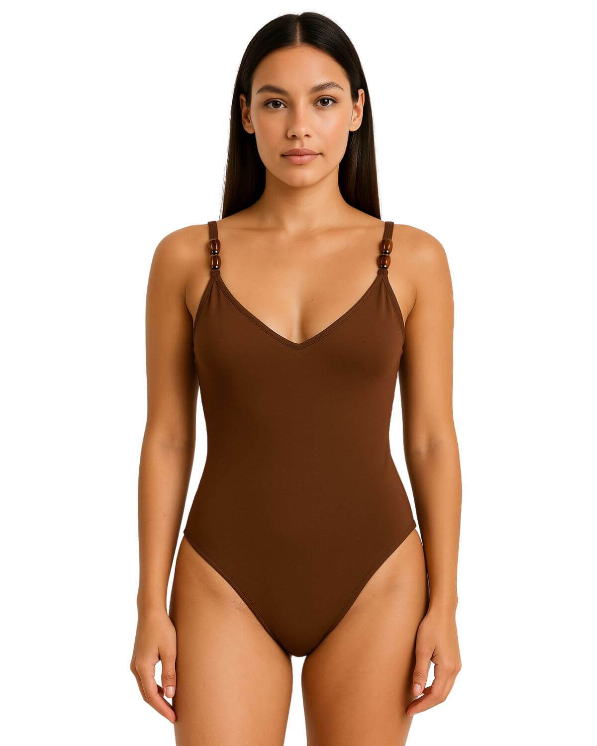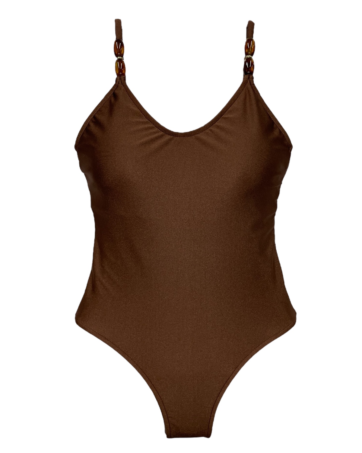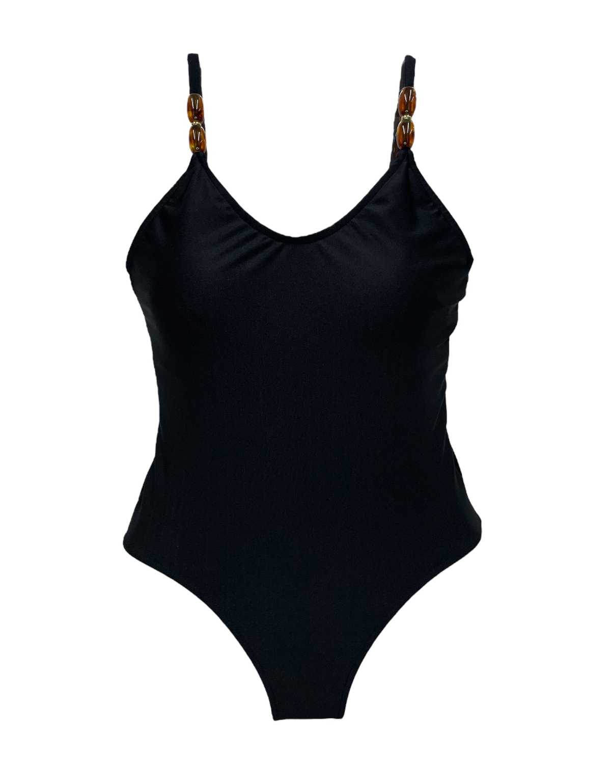 Maiô Básico alça fina com regulador. Costas decote em U. – Bojo removível – Detalhes nas alças feitos à mão com contas ( Beads) e metais.