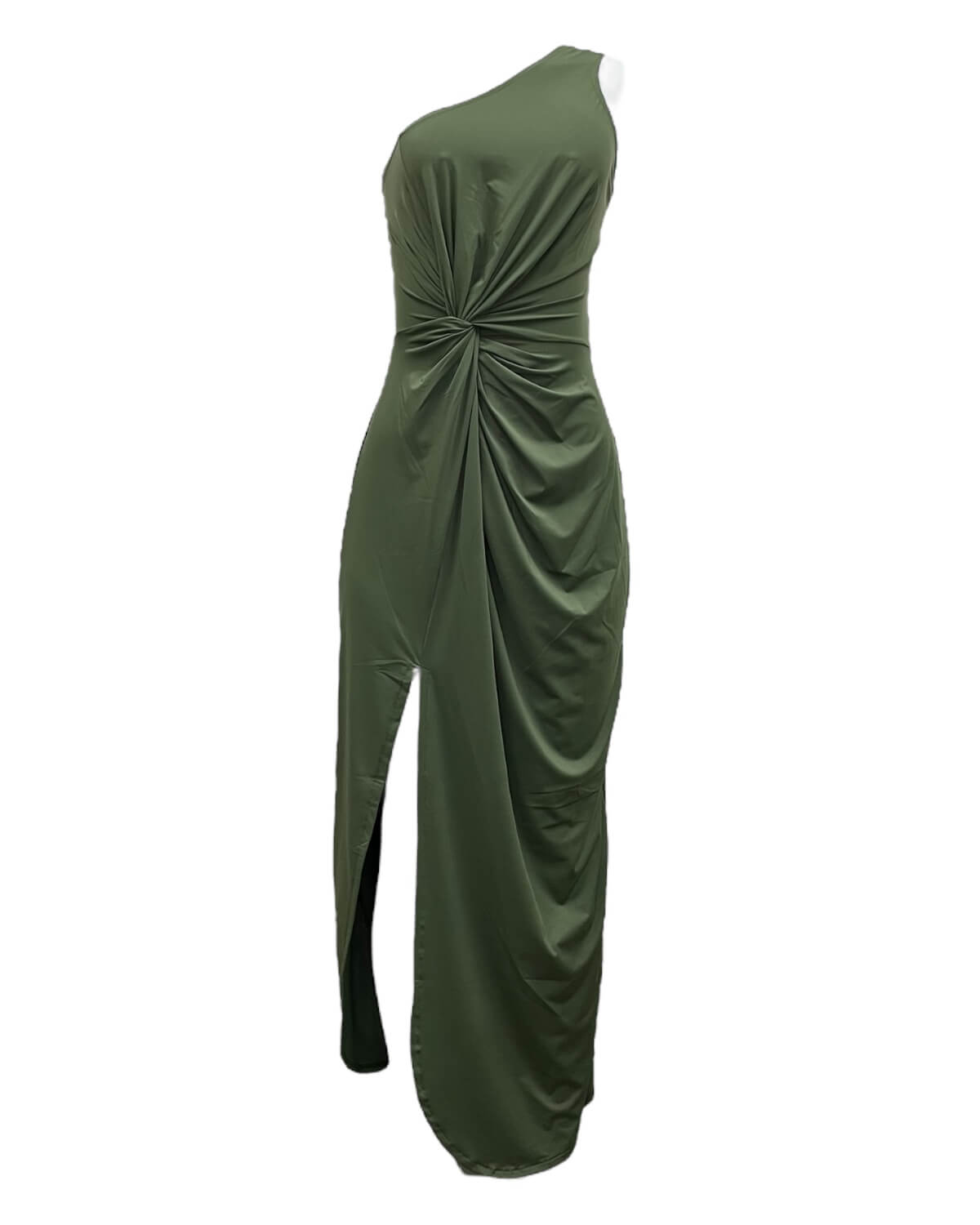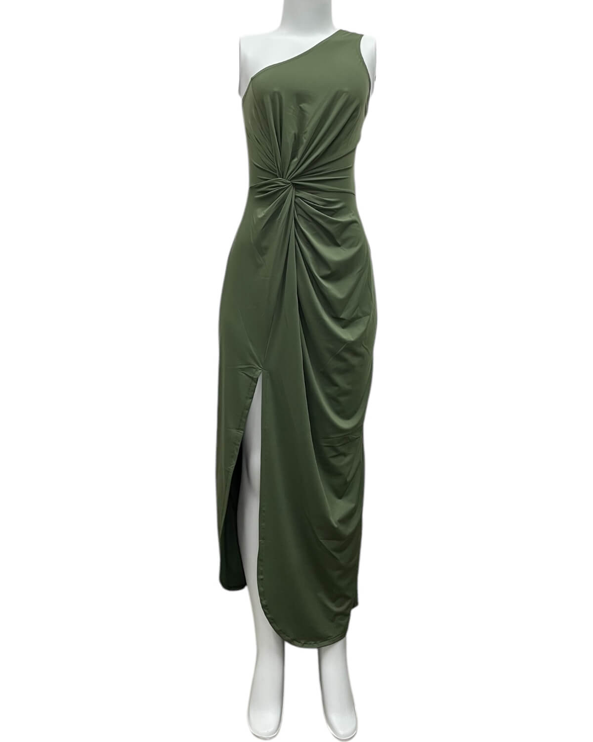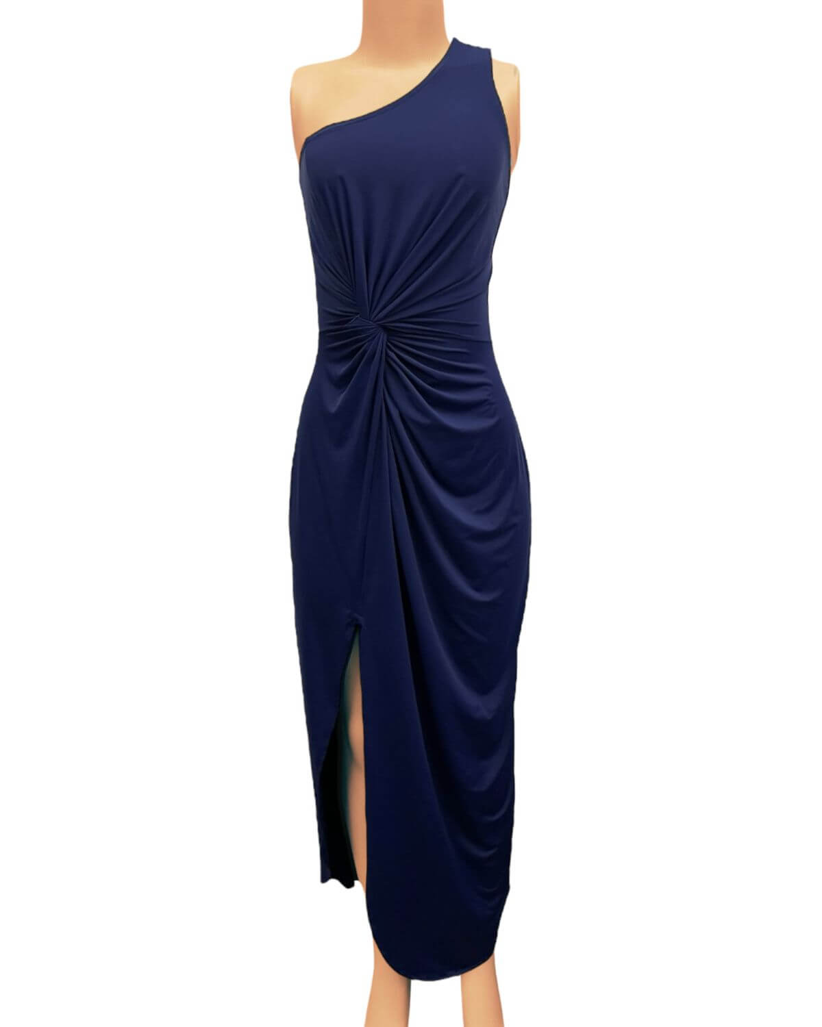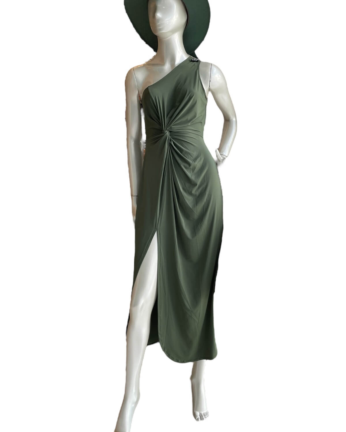 Design elegante, drapeado na cintura entrelaçada que realça a silhueta, o detalhe da fenda lateral adiciona sensualidade e movimento.
