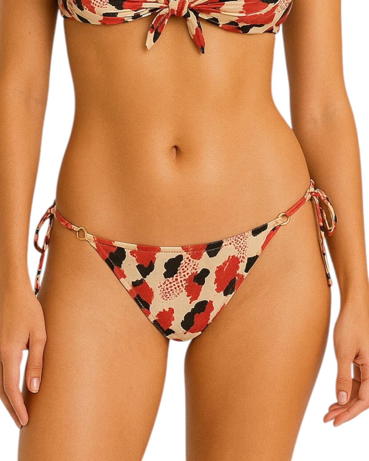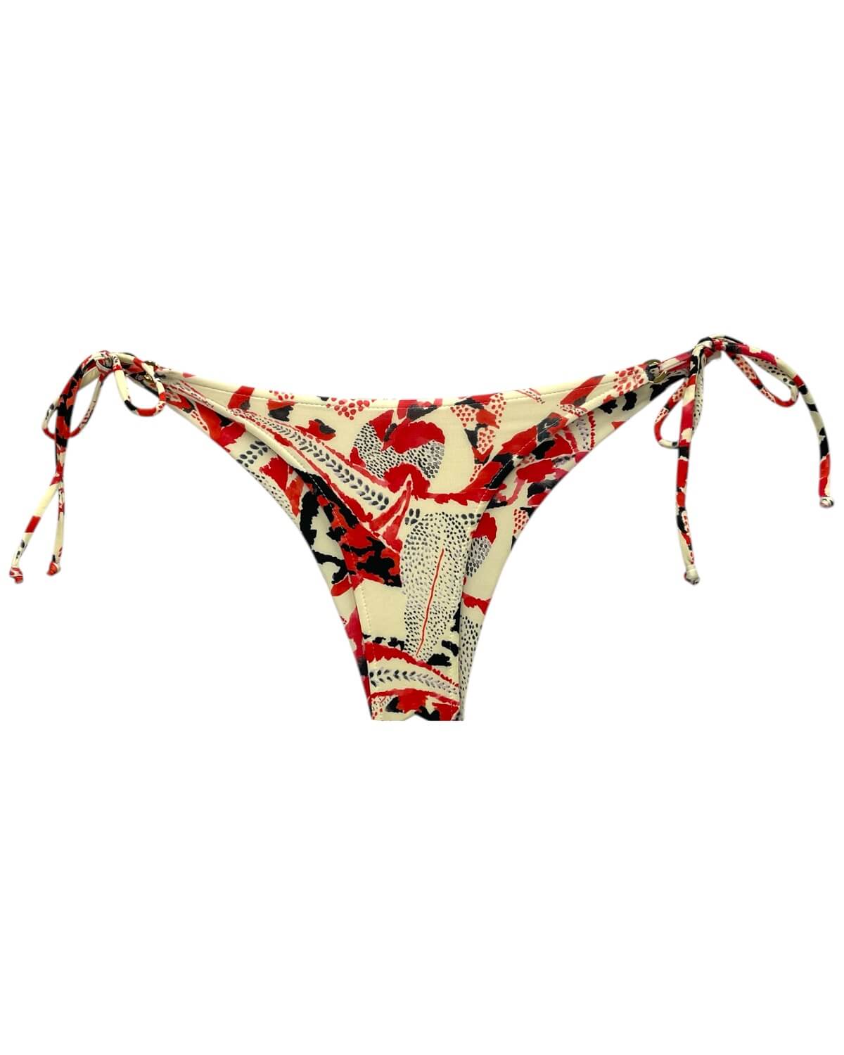 Tanga de Biquíni sem costura na parte de traz, com amarração lateral e detalhe de argolinha dourada.