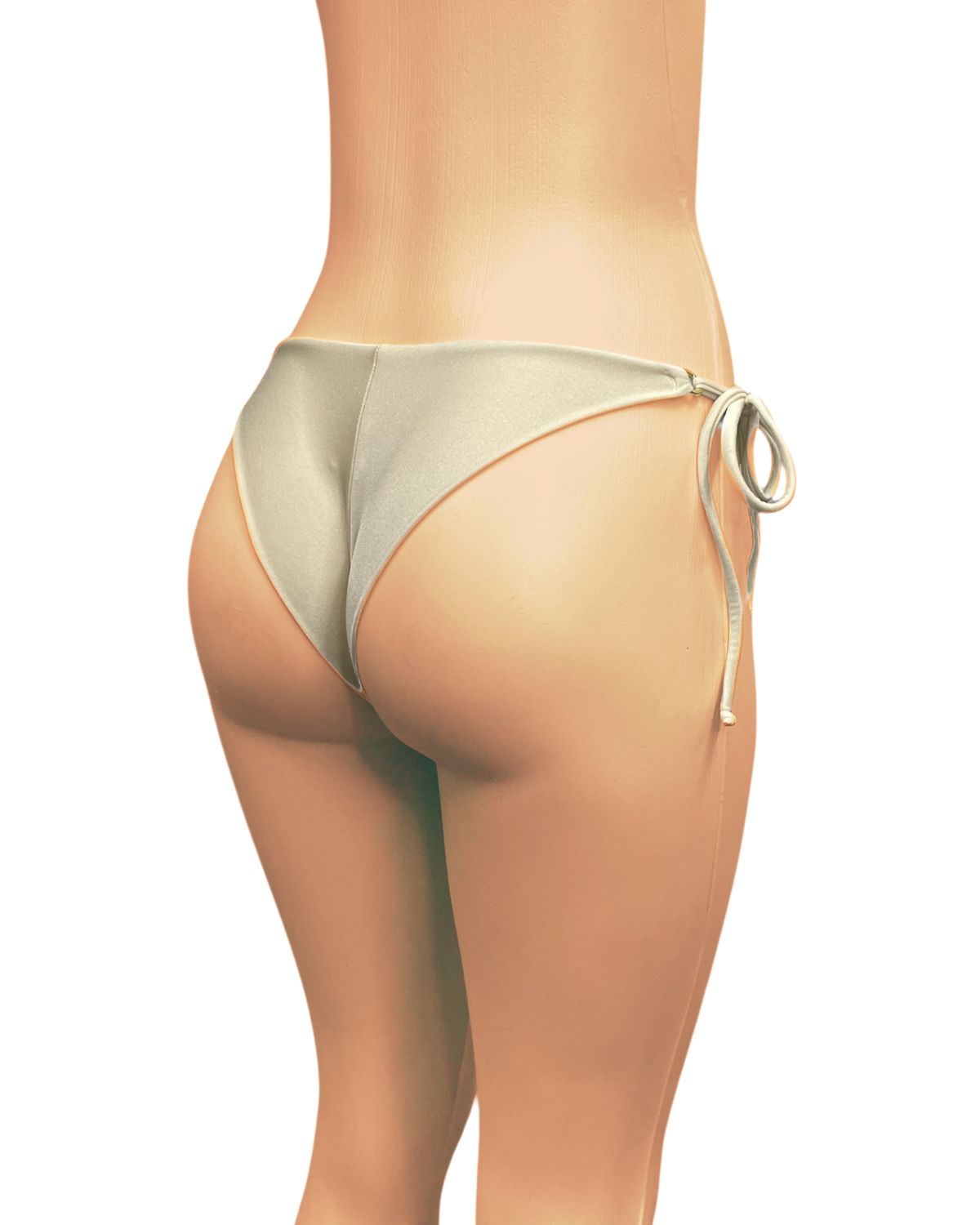 Tanga de biquíni sem costura na parte de traz, com amarração lateral e detalhe de argolinha dourada.