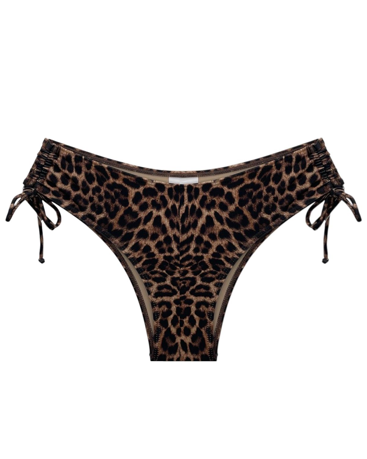 Tanga de biquíni lateral média com detalhe franzido e regulável.