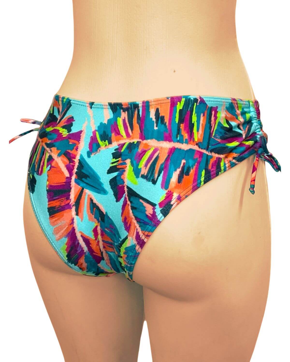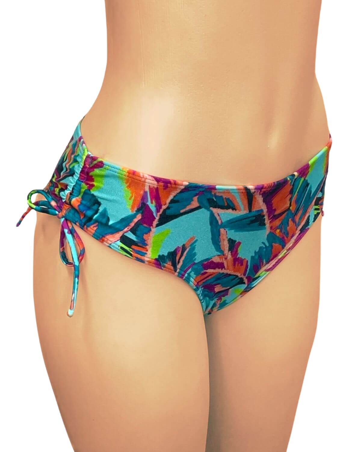 Tanga de biquíni lateral média com detalhe franzido e regulável.