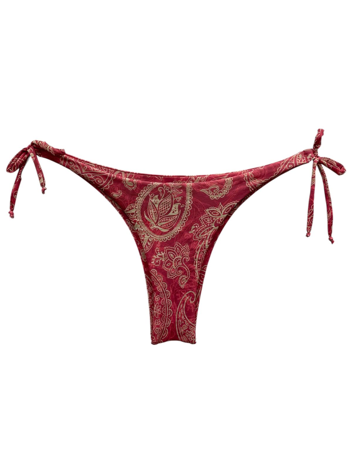 Tanga de biquíni estampada lateral estreita com amarração e acabamento com elástico embutido. Modelagem pequena.
