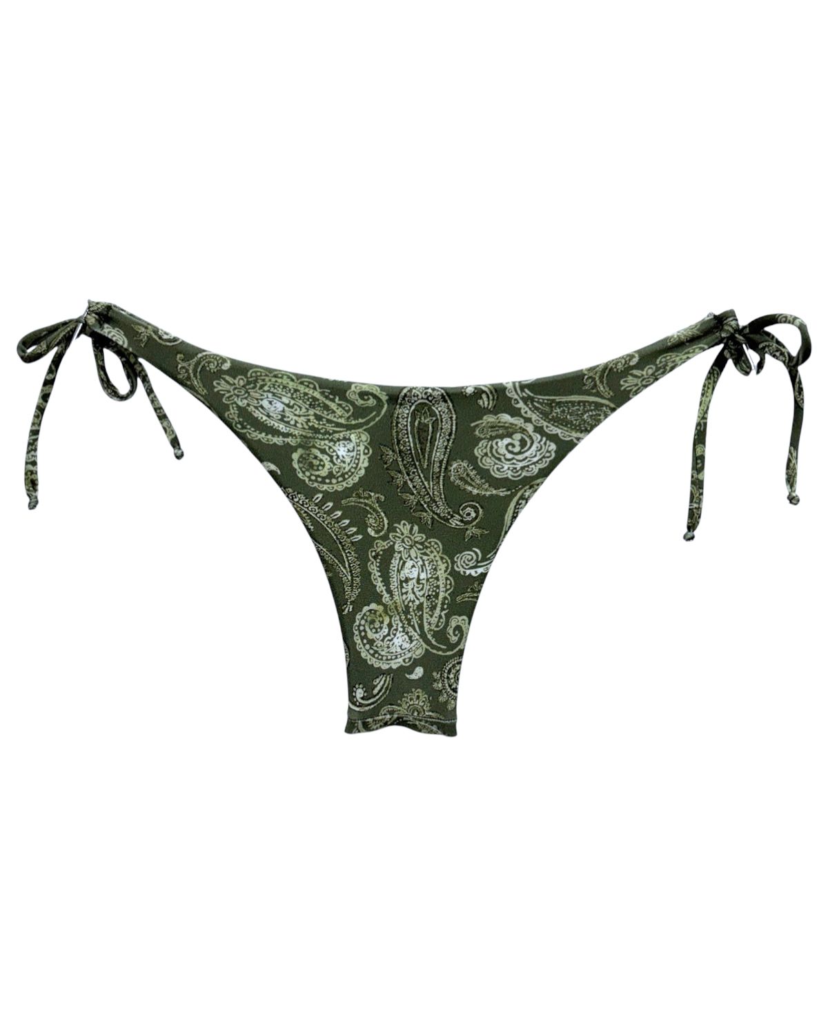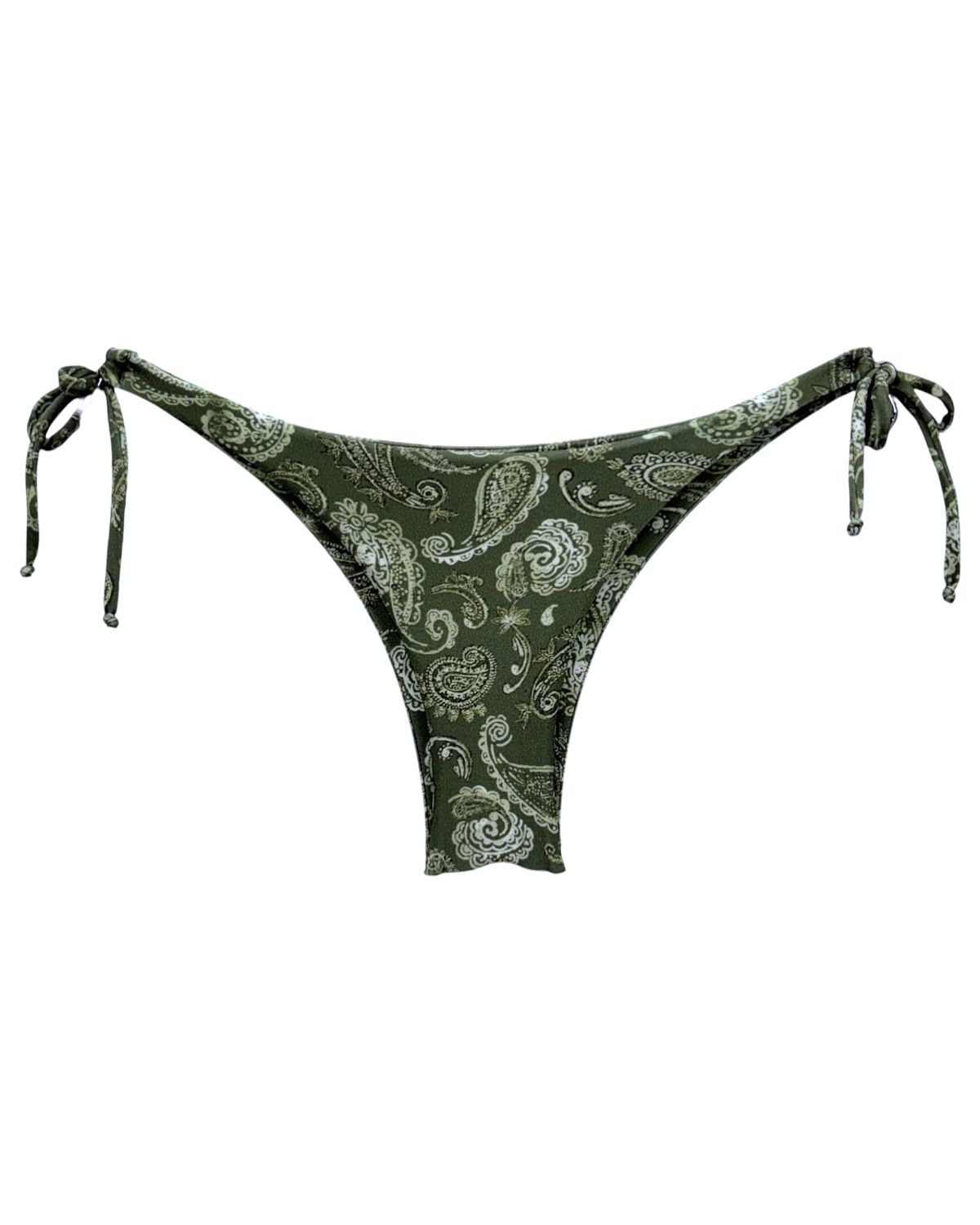 Tanga de biquíni estampada lateral estreita com amarração e acabamento com elástico embutido. Modelagem pequena.