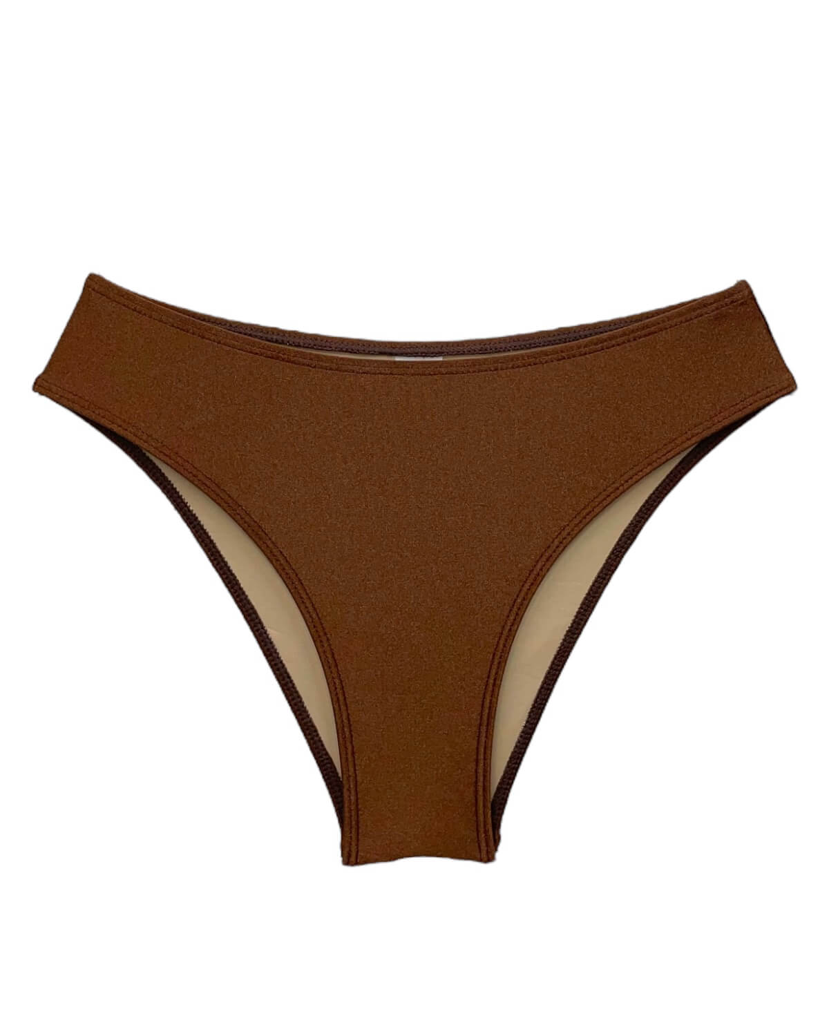 Tanga de biquíni básica modelo mais alto cor Cappuccino. Confeccionada em lycra com leve brilho.