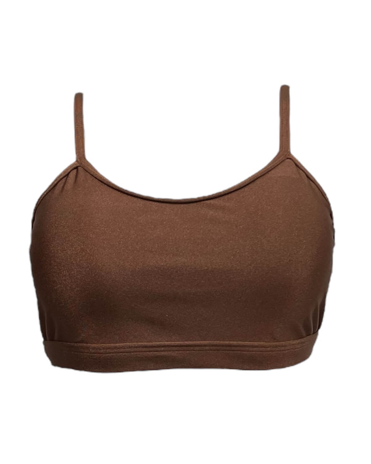Top básico com bojo removível, cós elástico e alças estreitas, possui decote redondo frontal e nas costas abertas.