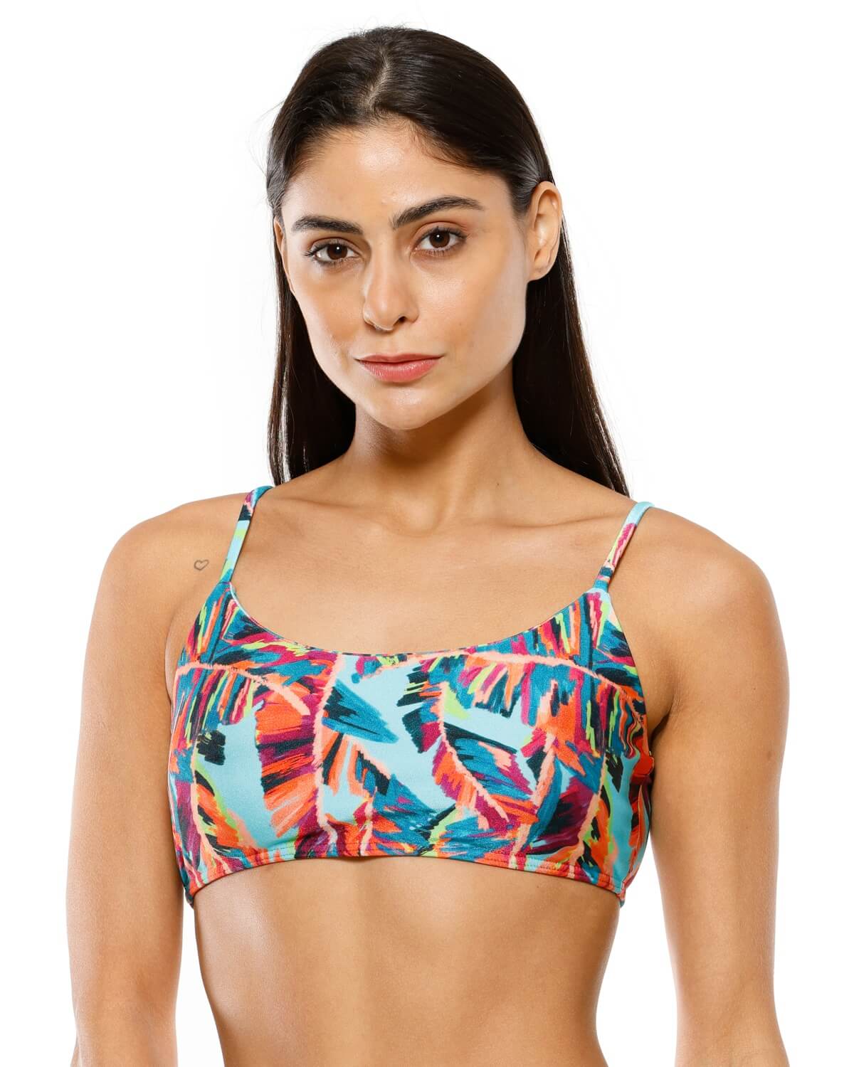 Top de biquíni básico estampado com decote redondo, costas reta, alças reguláveis e bojo removível. Modelo ideal para quem busca conforto