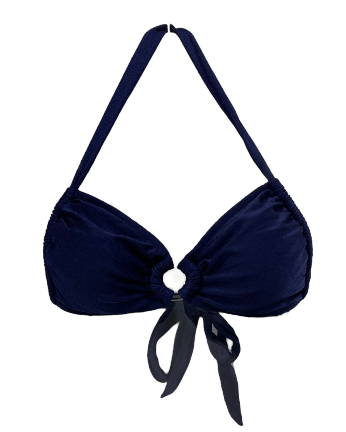 Top de biquíni com ajuste na lateral do busto, argola frontal e amarração nas costas. Possui bojo removível.