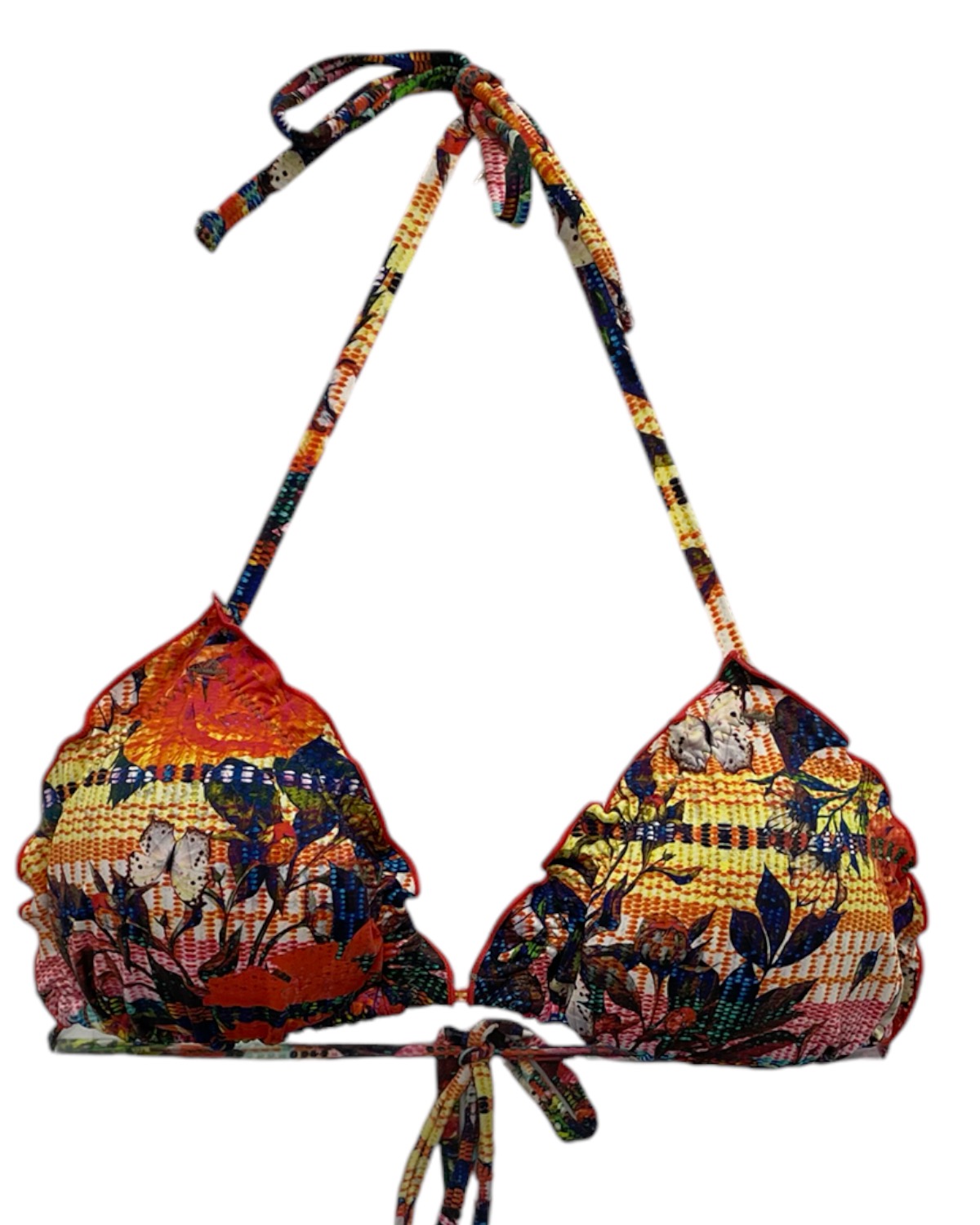 Top de biquíni cortininha com babadinho contrastante e bojo removível. Possui amarração no pescoço e nas costas.