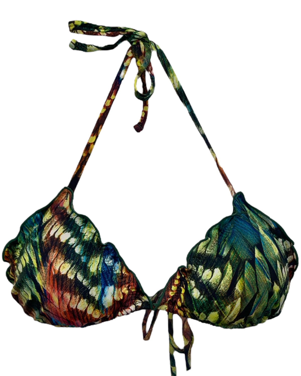 Top de biquíni cortininha com babadinho contrastante e bojo removível. Possui amarração no pescoço e nas costas.