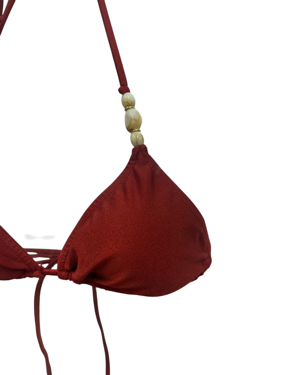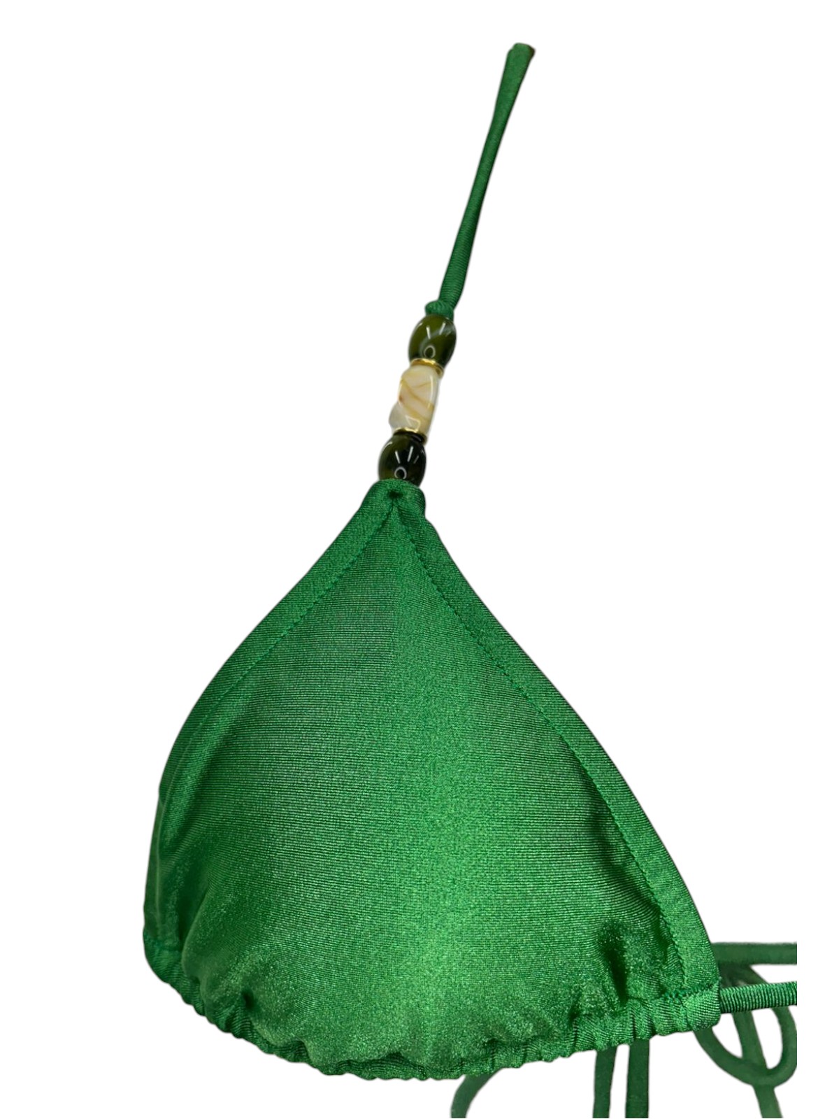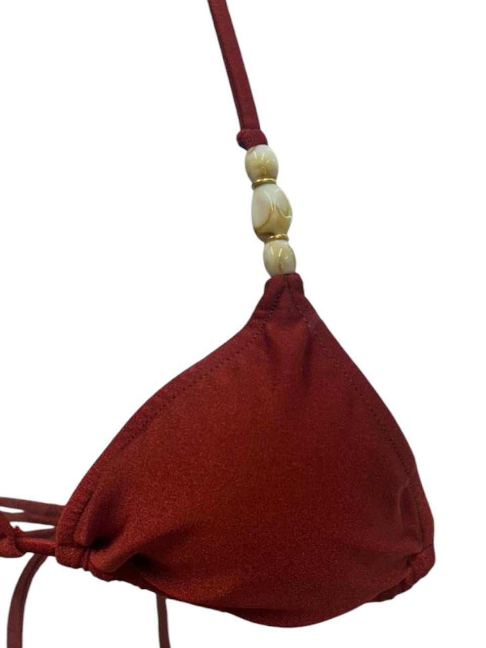 Top de biquíni modelo cortininha com bojo removível e amarração no pescoço e nas costas. Confeccionado em tecido trilobal com leve brilho. Detalhes nas alças feitos à mão com contas ( Beads) e metais.