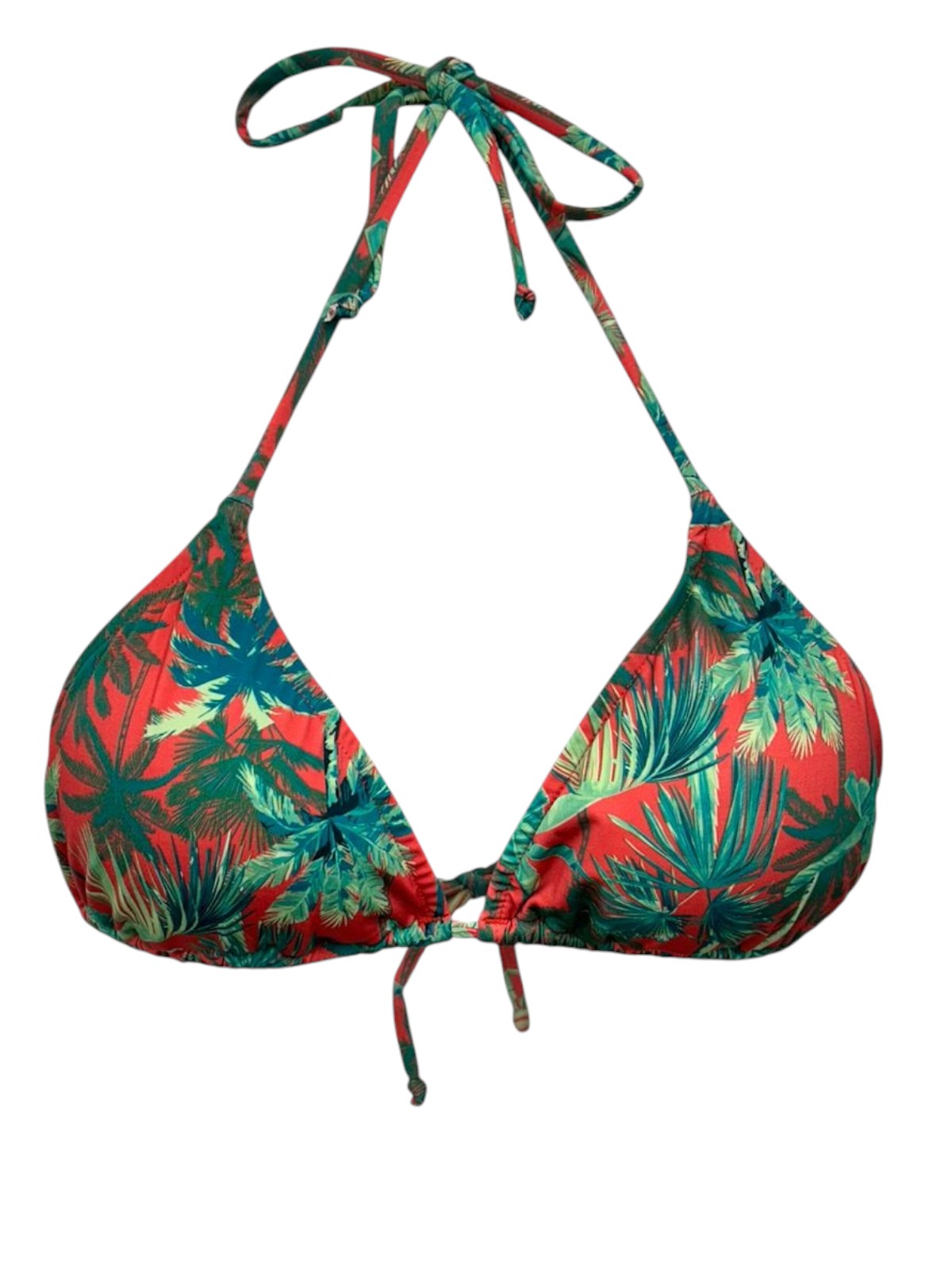 Top de biquíni modelo cortininha com bojo removível e amarração no pescoço e nas costas.