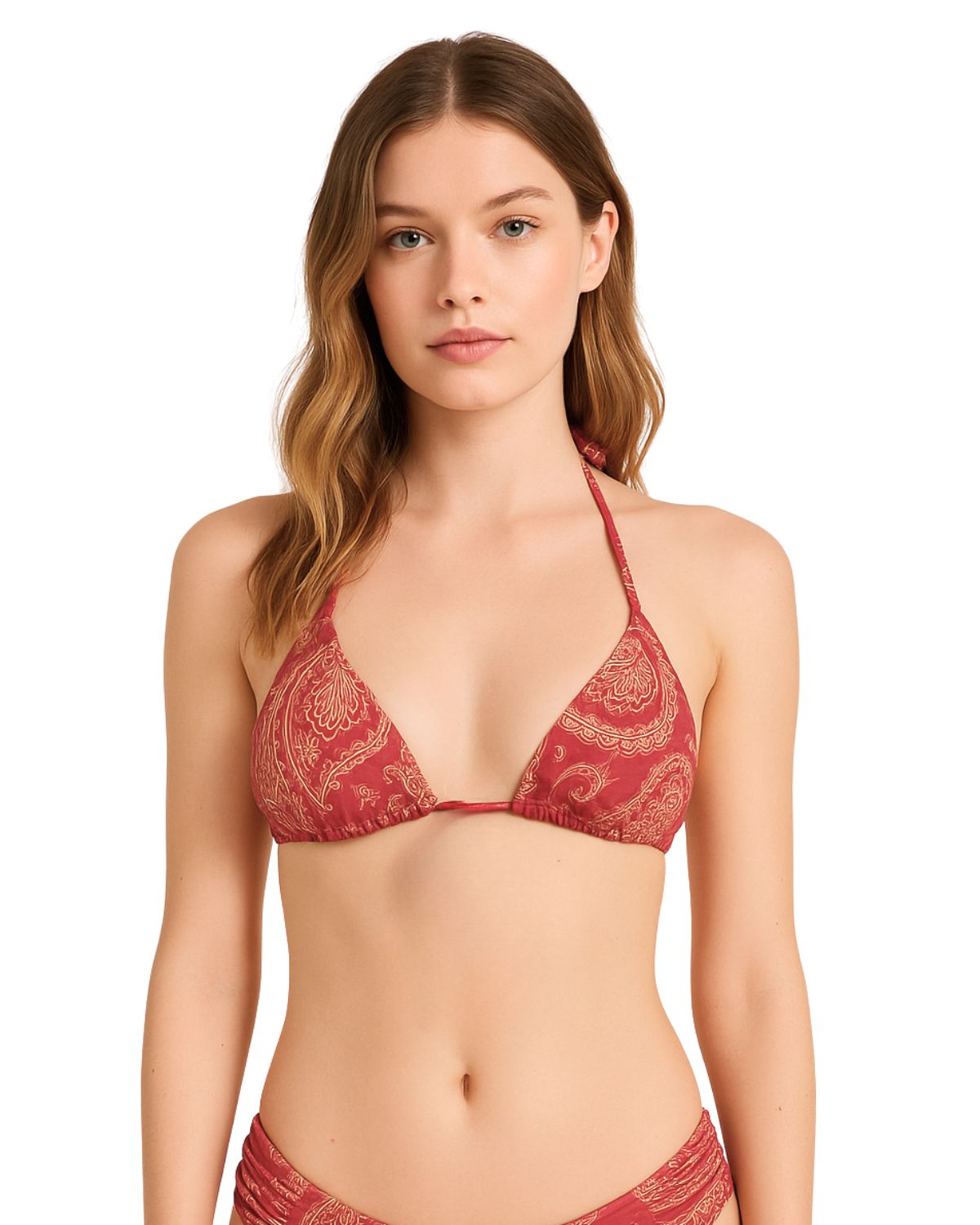Top de biquíni modelo cortininha com bojo removível e amarração no pescoço e nas costas. Estampa: Boho Chic