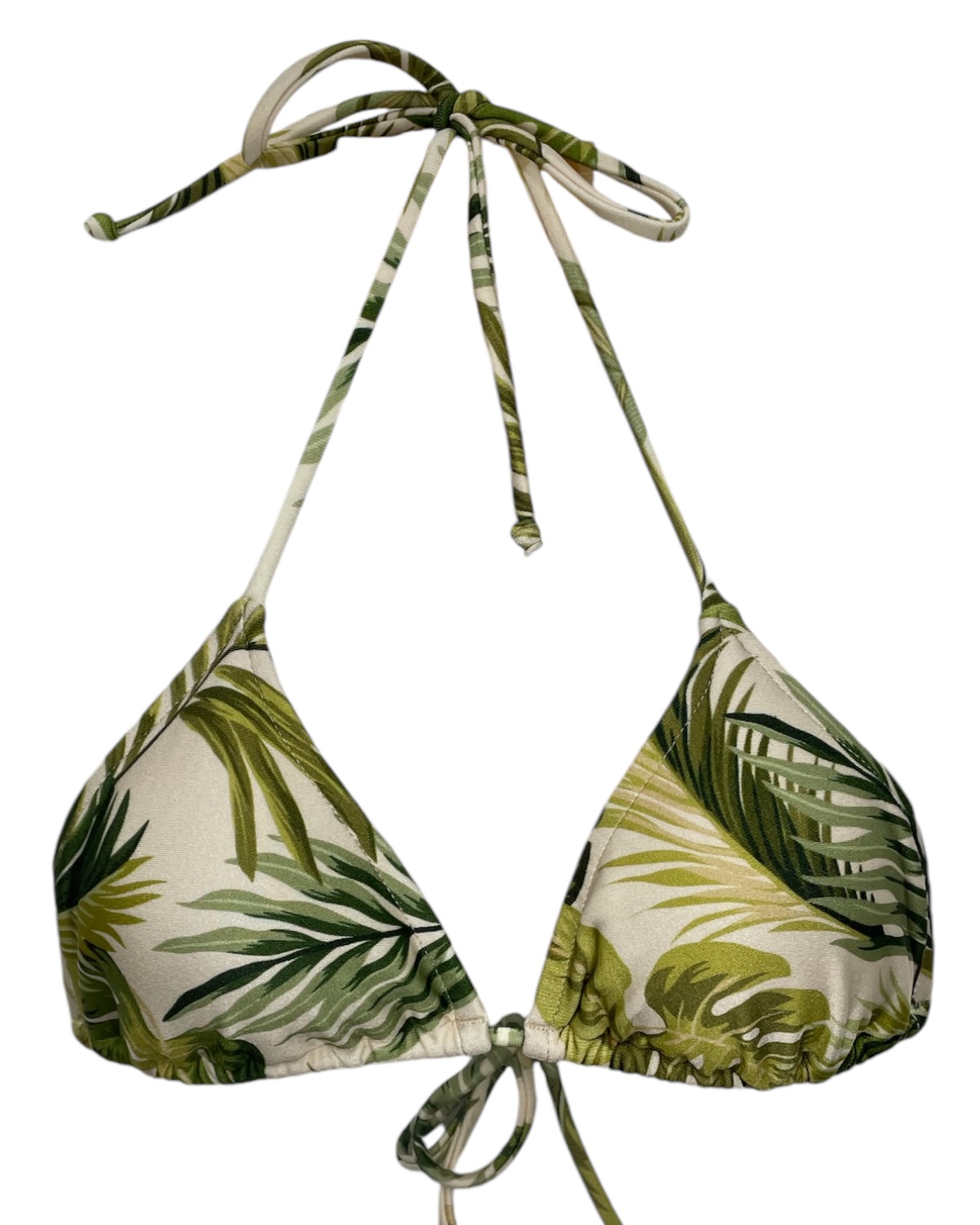 Top de biquíni modelo cortininha com bojo removível e amarração no pescoço e nas costas. Estampa: Leaves