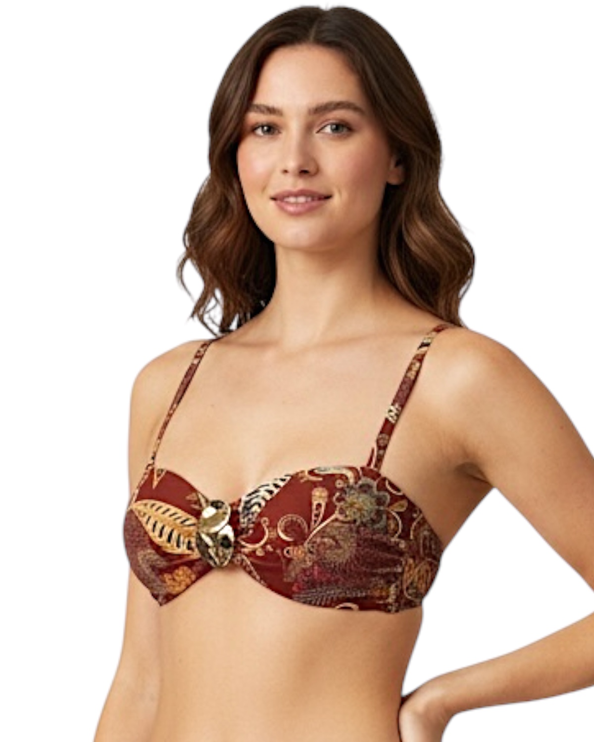 Top de biquíni estampado modelo tomara que caia com fivela em formato circular dourado , bojo interno fixo e amarração nas costas. Possui alças removíveis e ajustáveis. Modelo com boa sustentação pois possui liberdade de ajustes ao corpo.