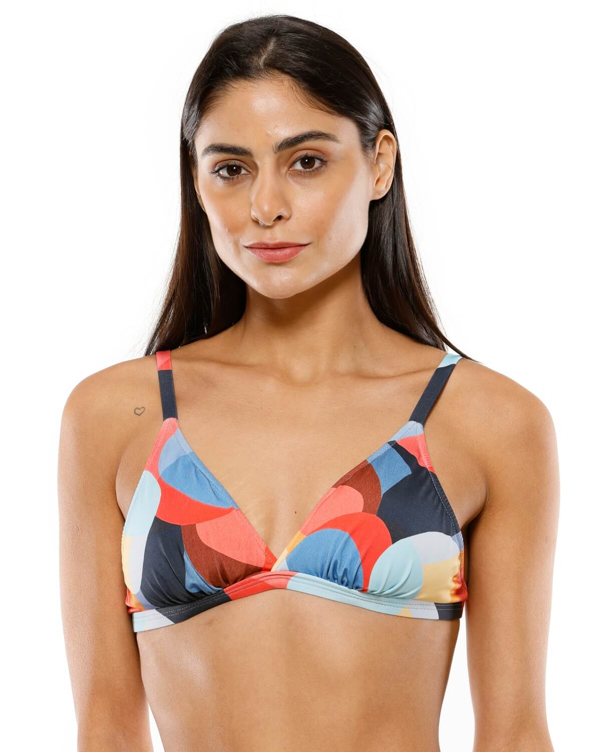 Top de biquíni com bojo removível, levemente transpassado na frente com alças finas, reguláveis e fecho nas costas.