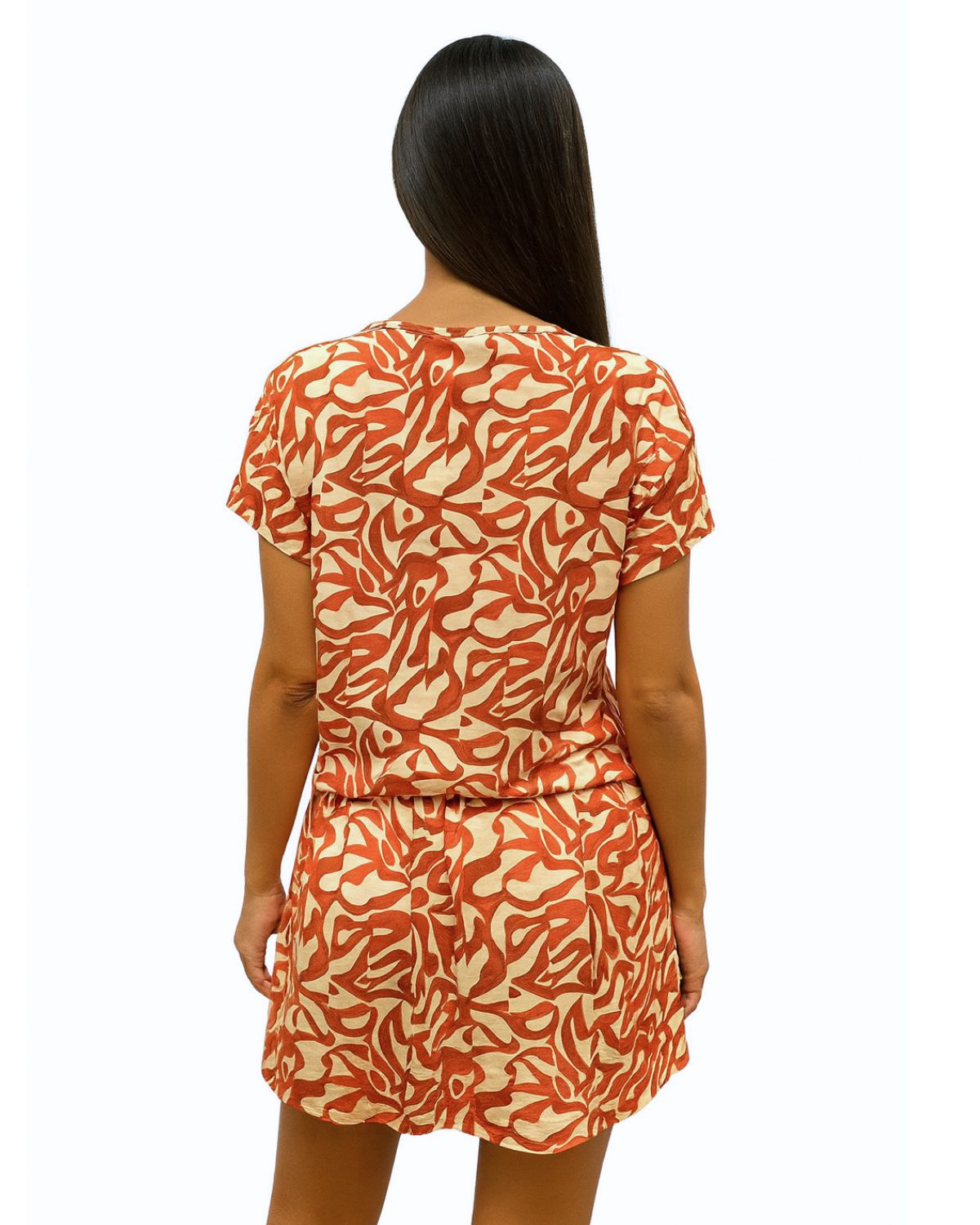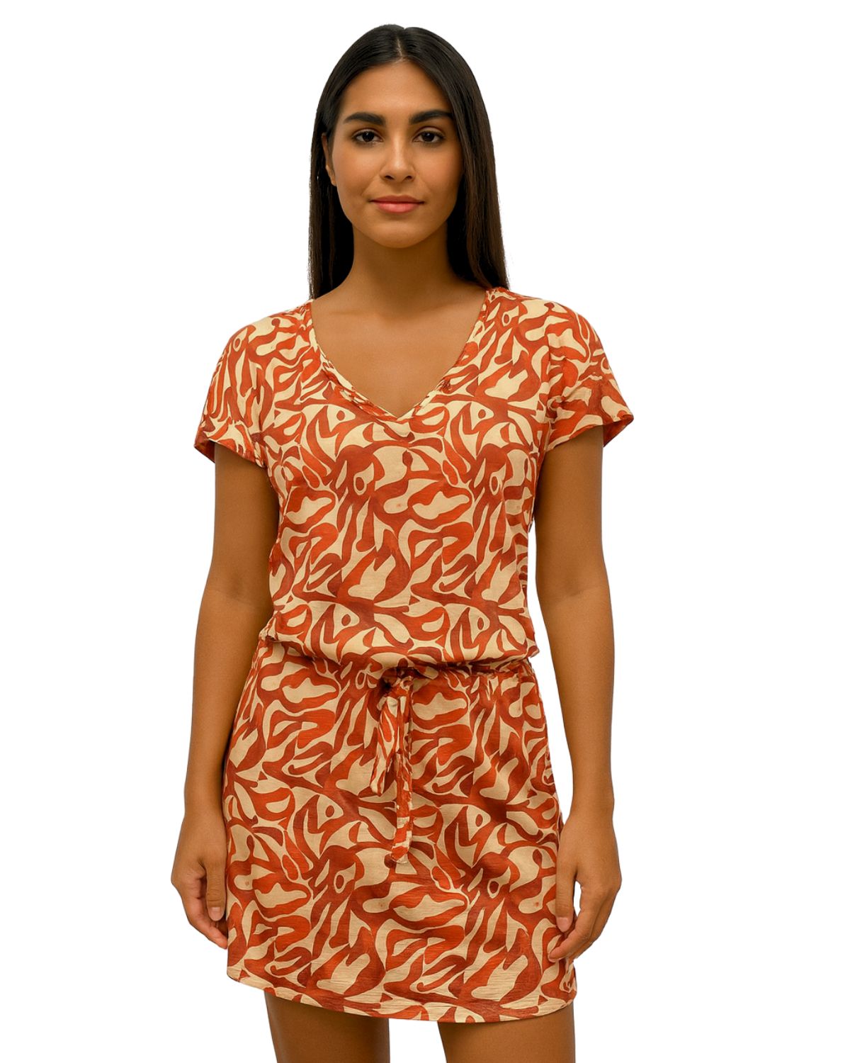 Vestido curto com amarração na cintura e decote V. Modelo confortável e ajustável ao corpo.