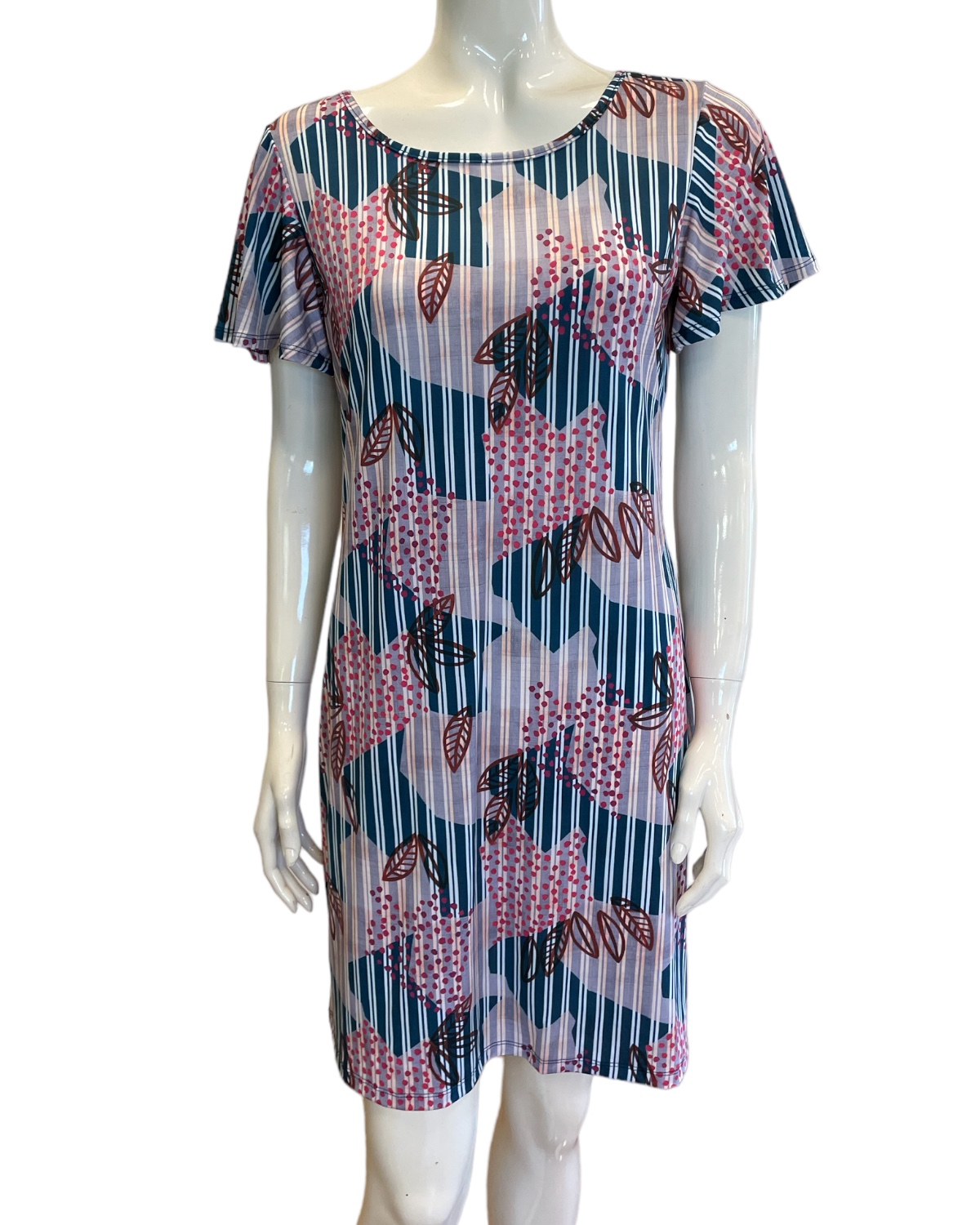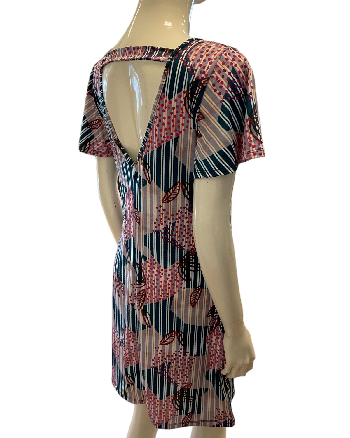 Vestido curto com manga curta e decote v nas costas. Pode ser usada como saída de praia e também para compor look casual.