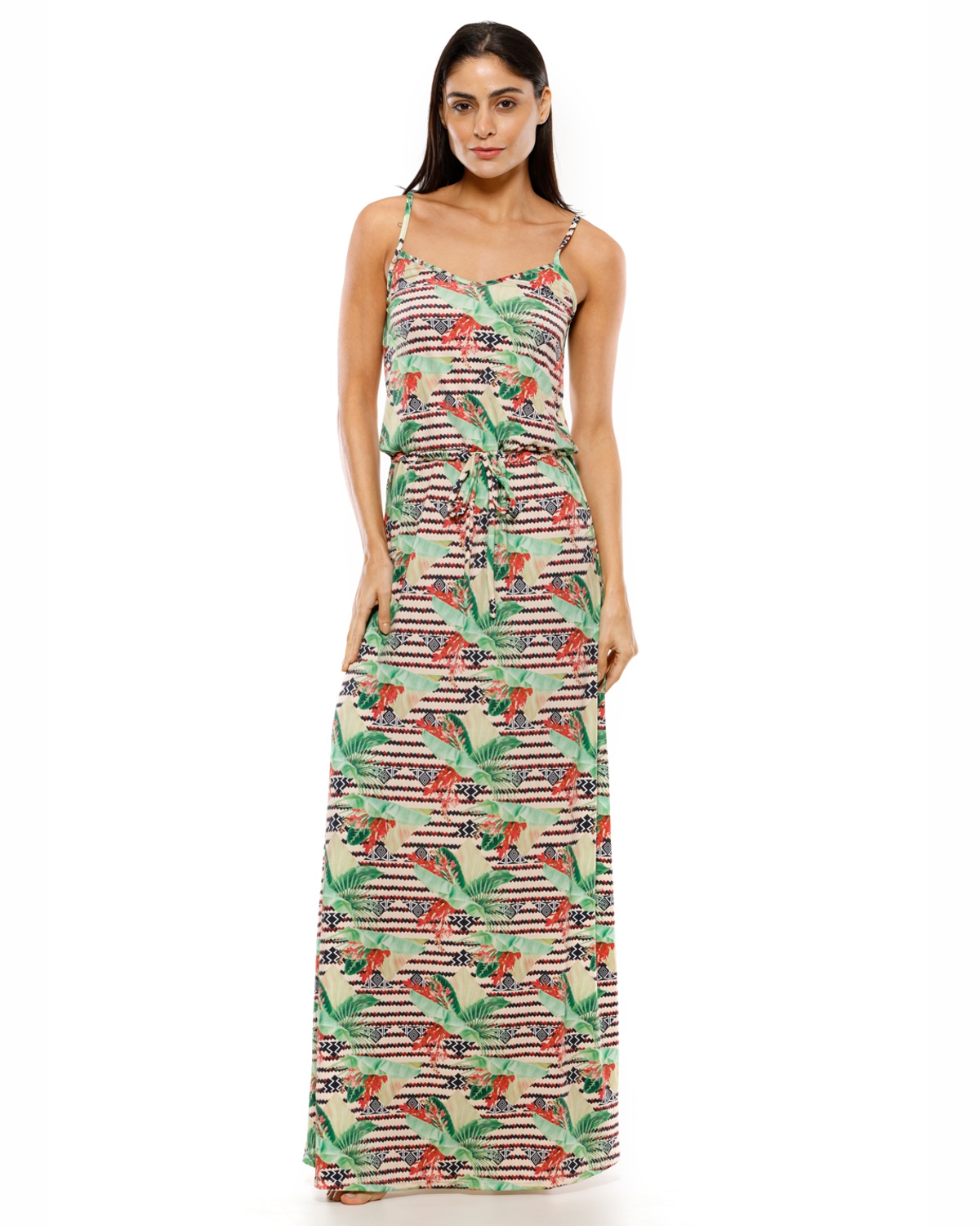 Vestido longo alça fina, com amarração na cintura e decote redondo na frente. Modelo confortável e ajustável ao corpo.