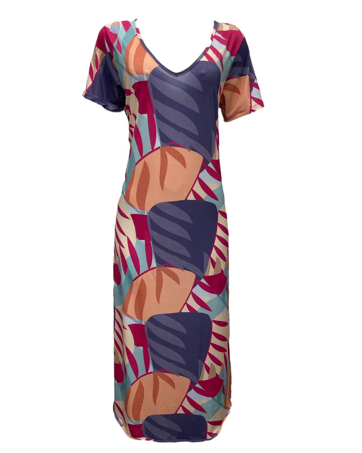 Vestido mídi com decote V e mangas curtas. Modelo reto e confortável, pode ser usada como saída de praia e também para compor look casual.