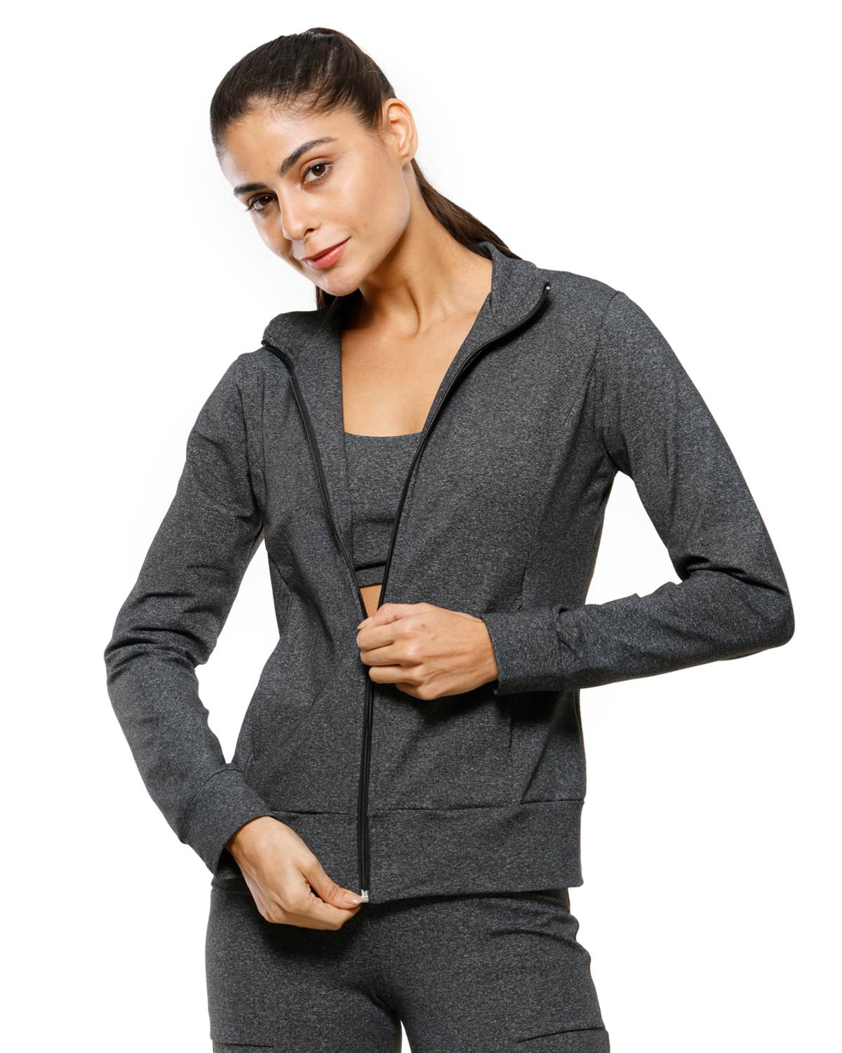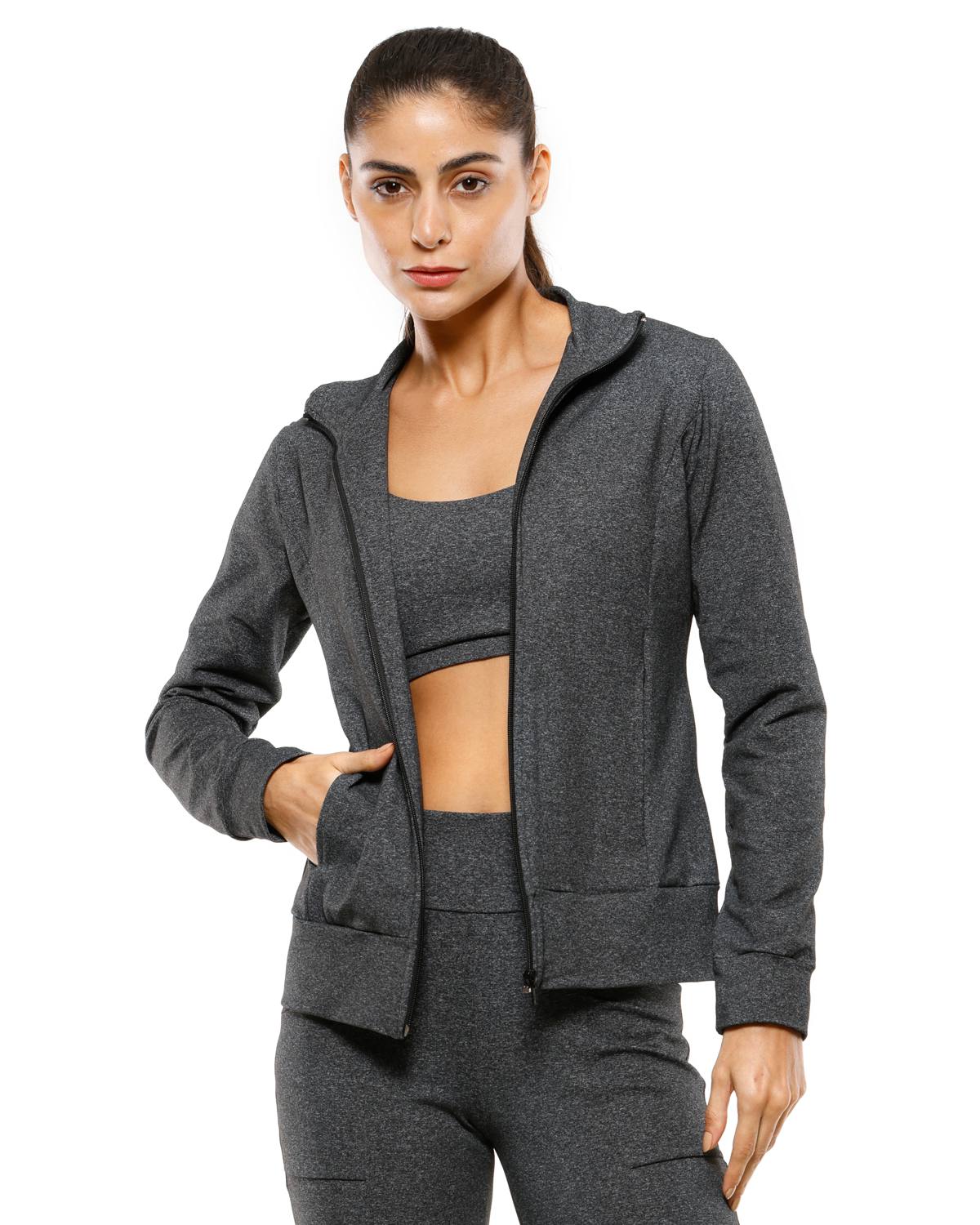 Jaqueta Fitness cor mescla, com gola e bolsos.