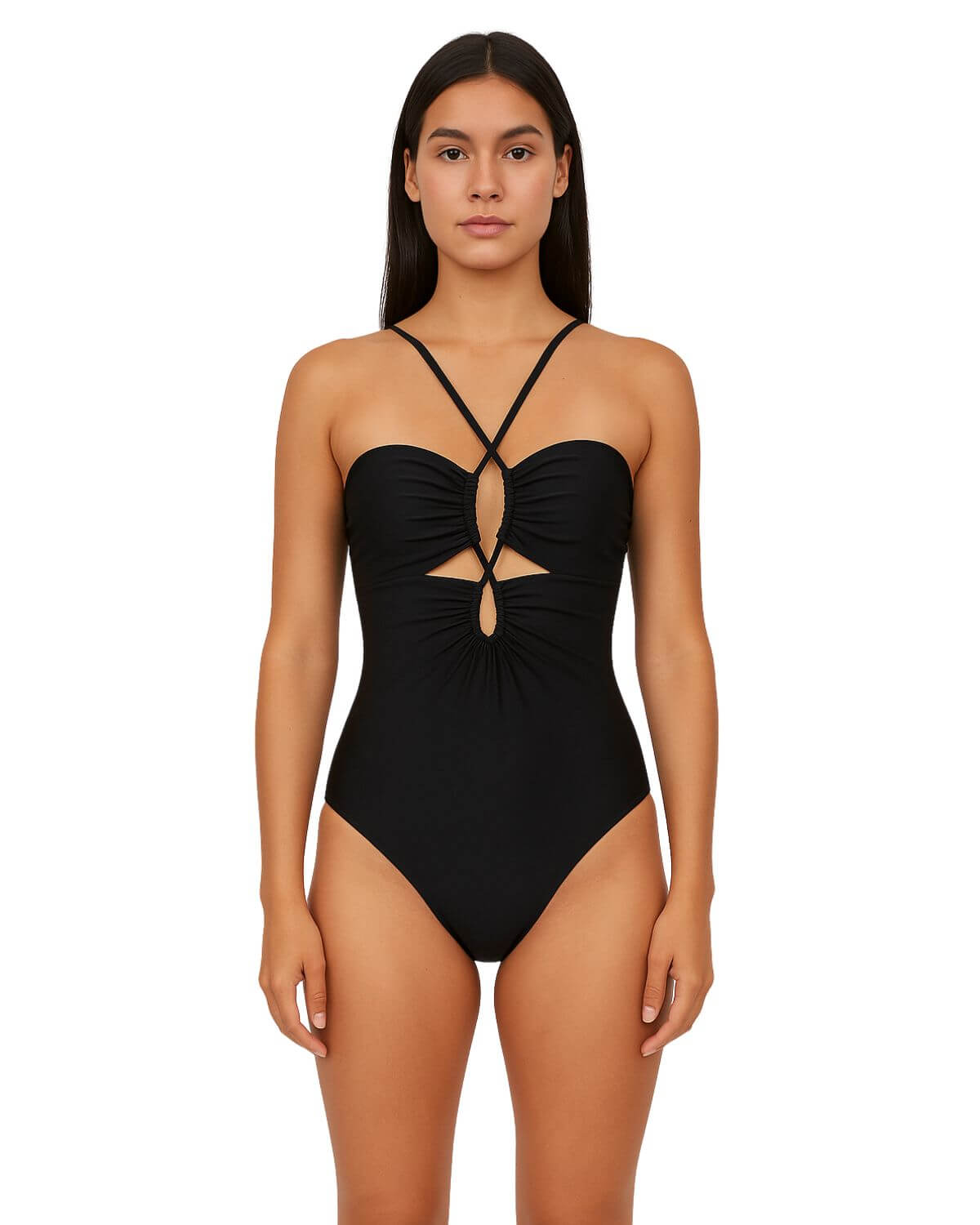 Maiô tomara que caia com detalhe frontal cruzado com recortes no decote e alças ajustáveis para amarração no pescoço ou nas costa ,