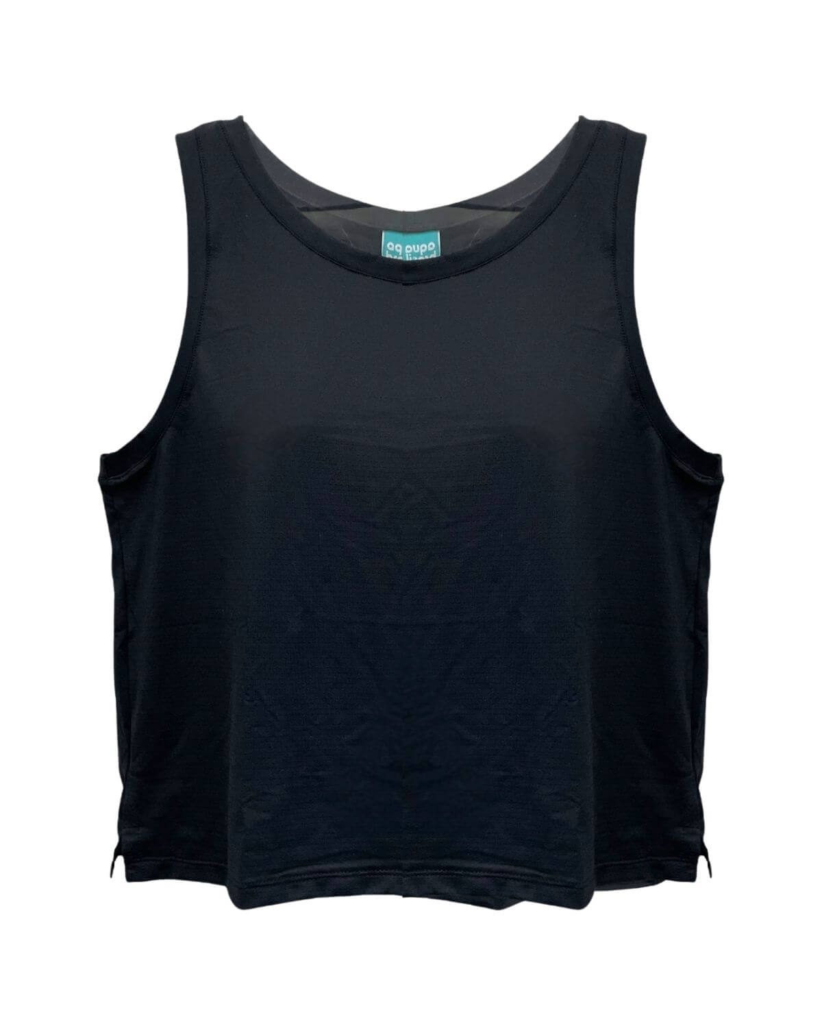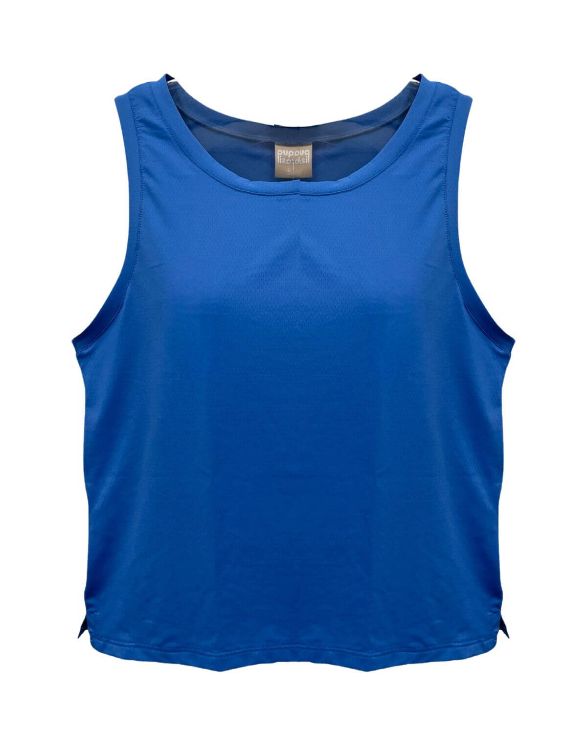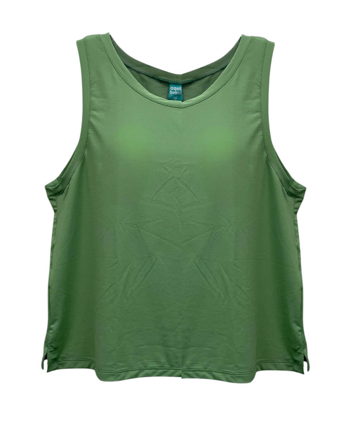 Cropped regata fitness modelagem mais soltinha ao corpo, comprimento na altura do quadril , decote frontal redondo e costas fechada.