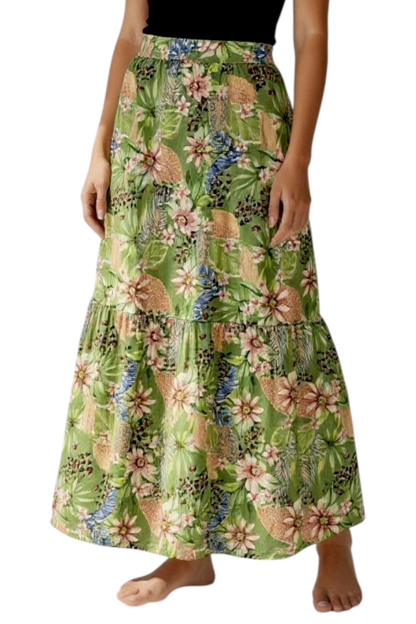 Saia longa três marias estampada com cós elástico e forrada no quadril.