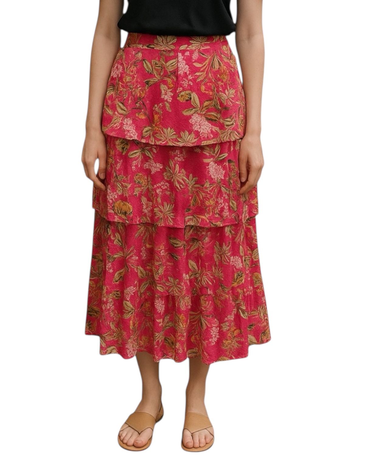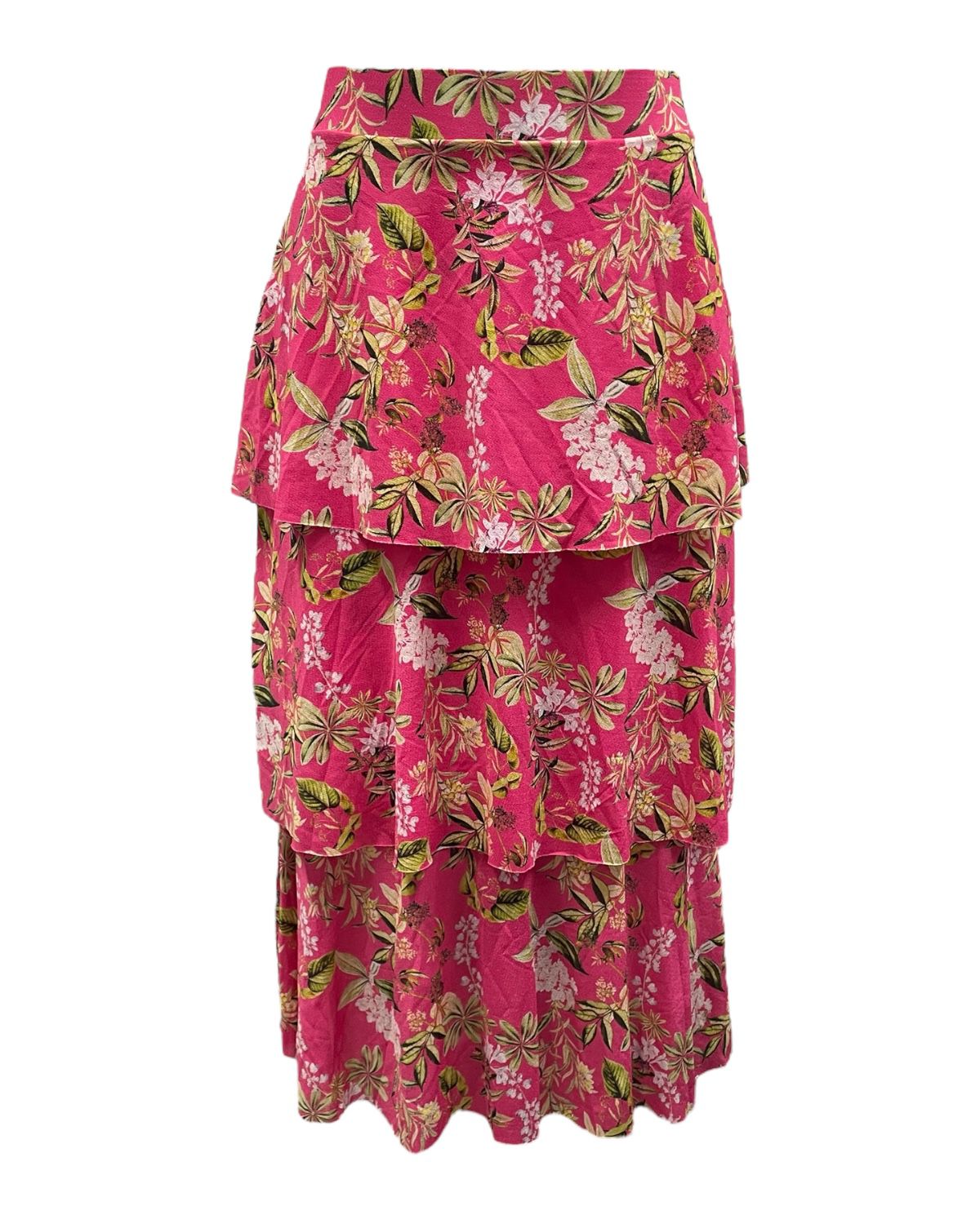 Saia midi com babados em camadas estampada com cós elástico.