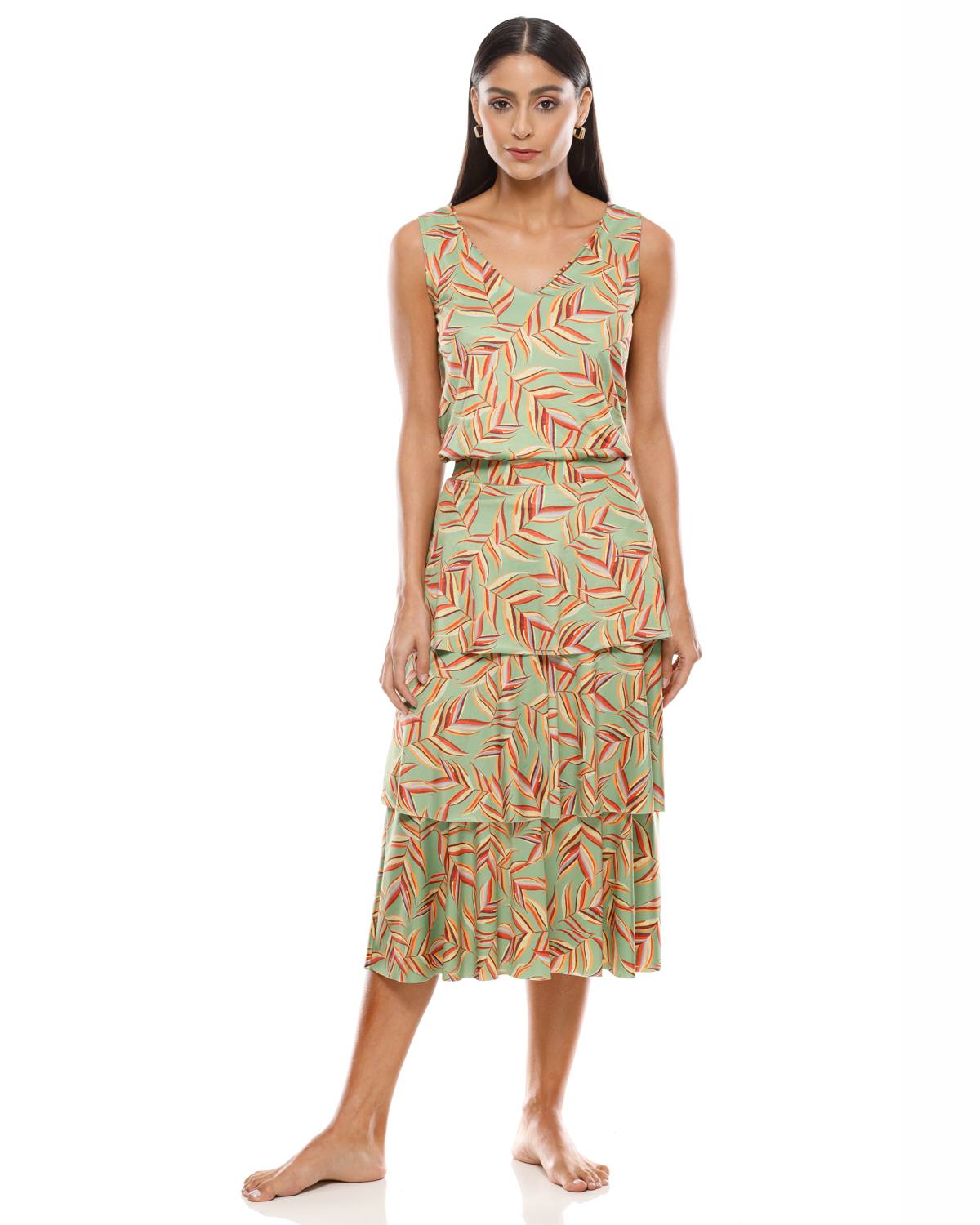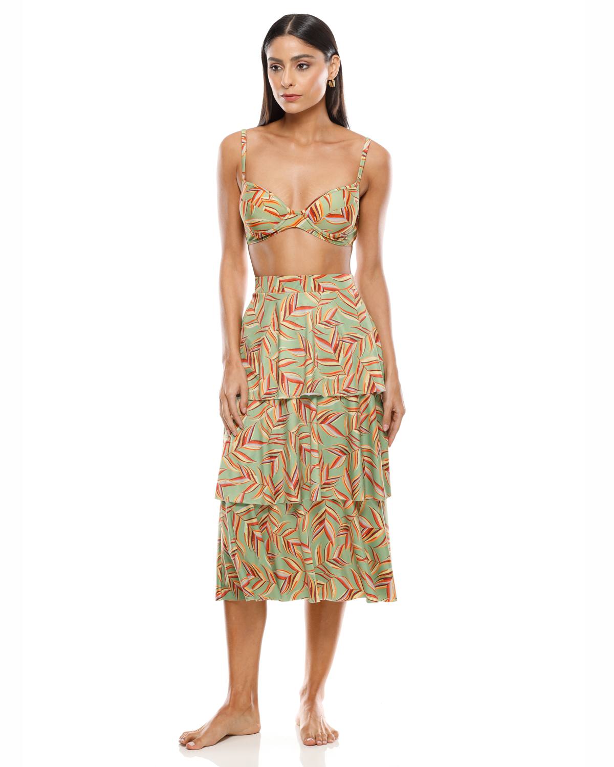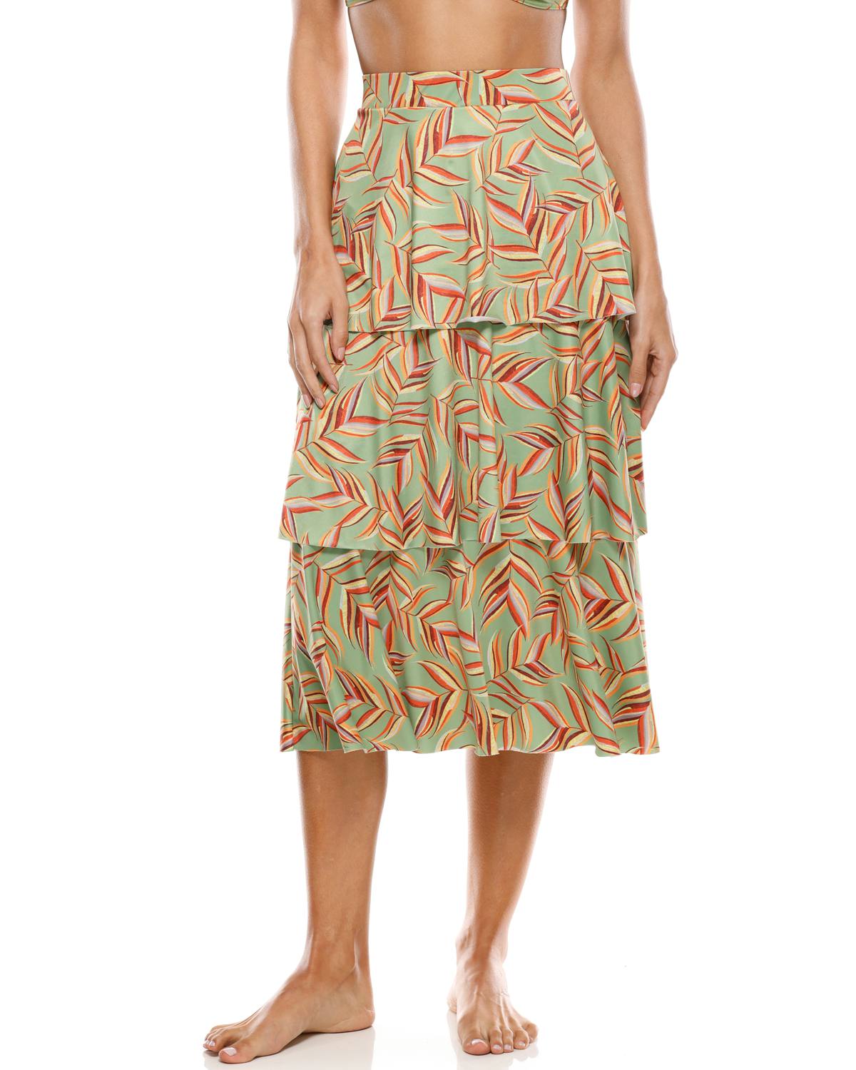 Saia midi com babados em camadas estampada com cós elástico e Confeccionada em tecido leve e fluido com caimento perfeito.