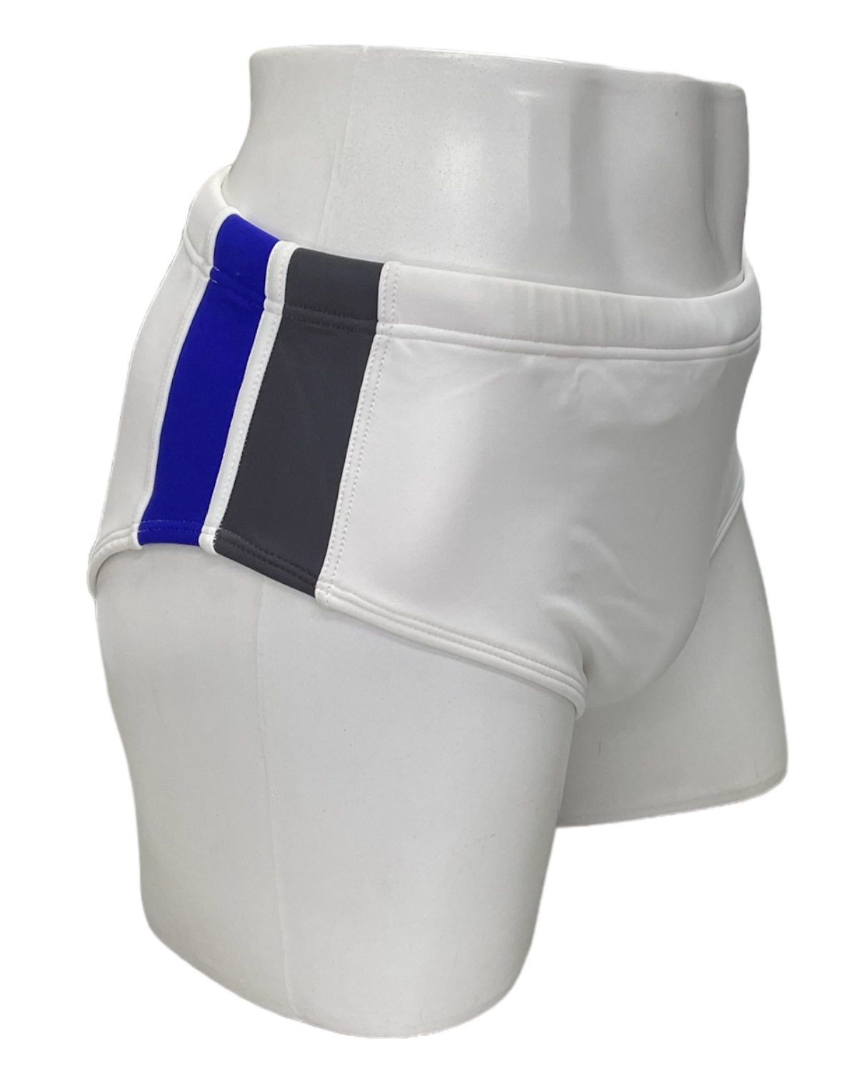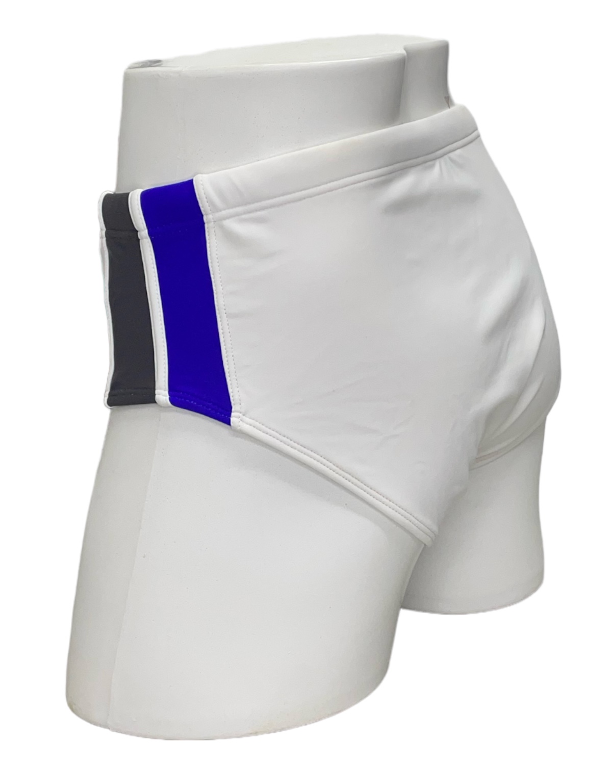 Sunga masculina lateral Estreita. Cor Branca com detalhe na lateral em cor cinza e Zafiro.