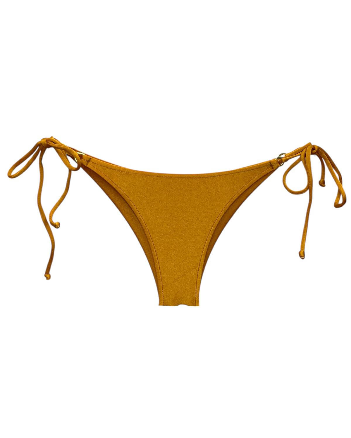 Tanga de biquíni sem costura na parte de traz, com amarração lateral e detalhe de argolinha dourada.