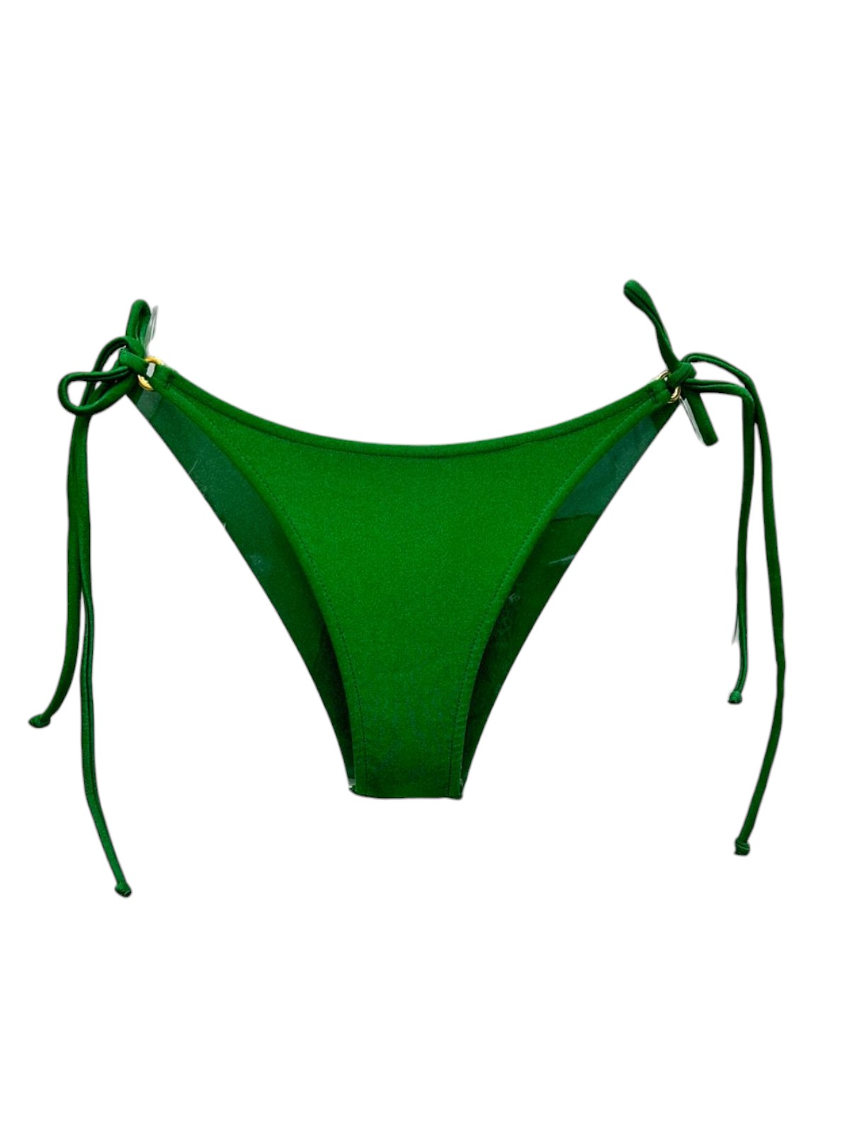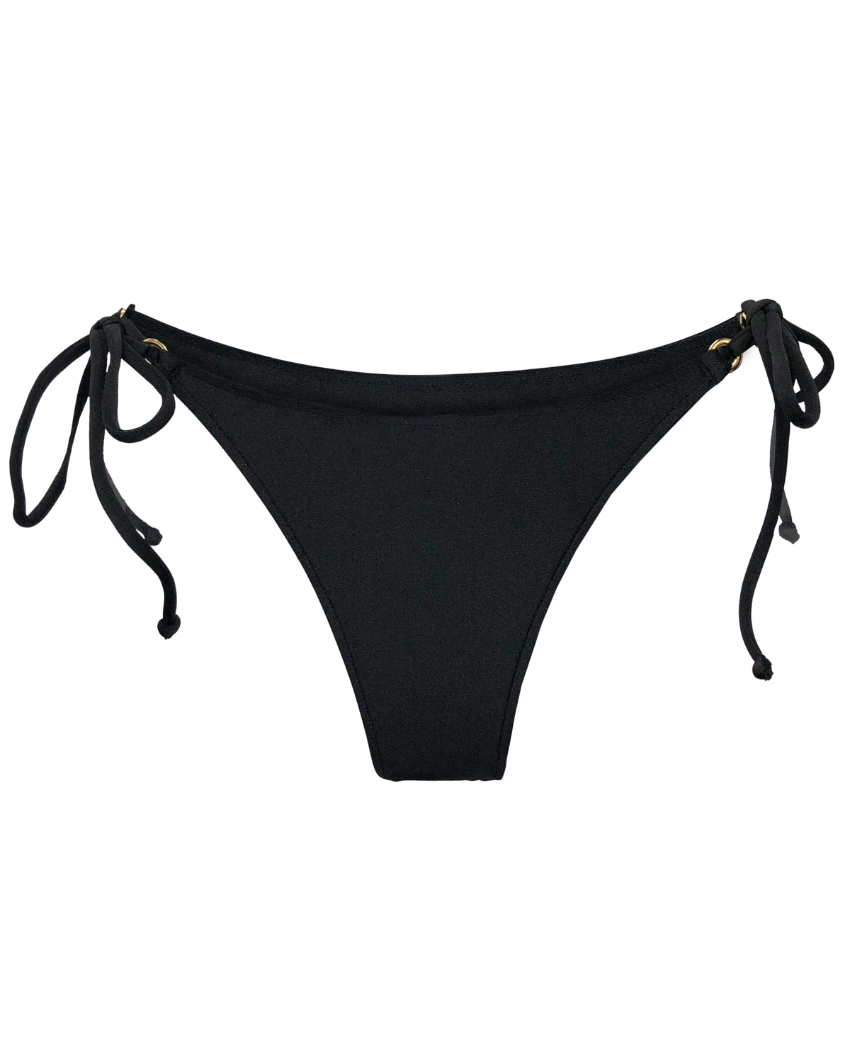 Tanga de biquíni sem costura na parte de traz, com amarração lateral e detalhe de argolinha dourada.