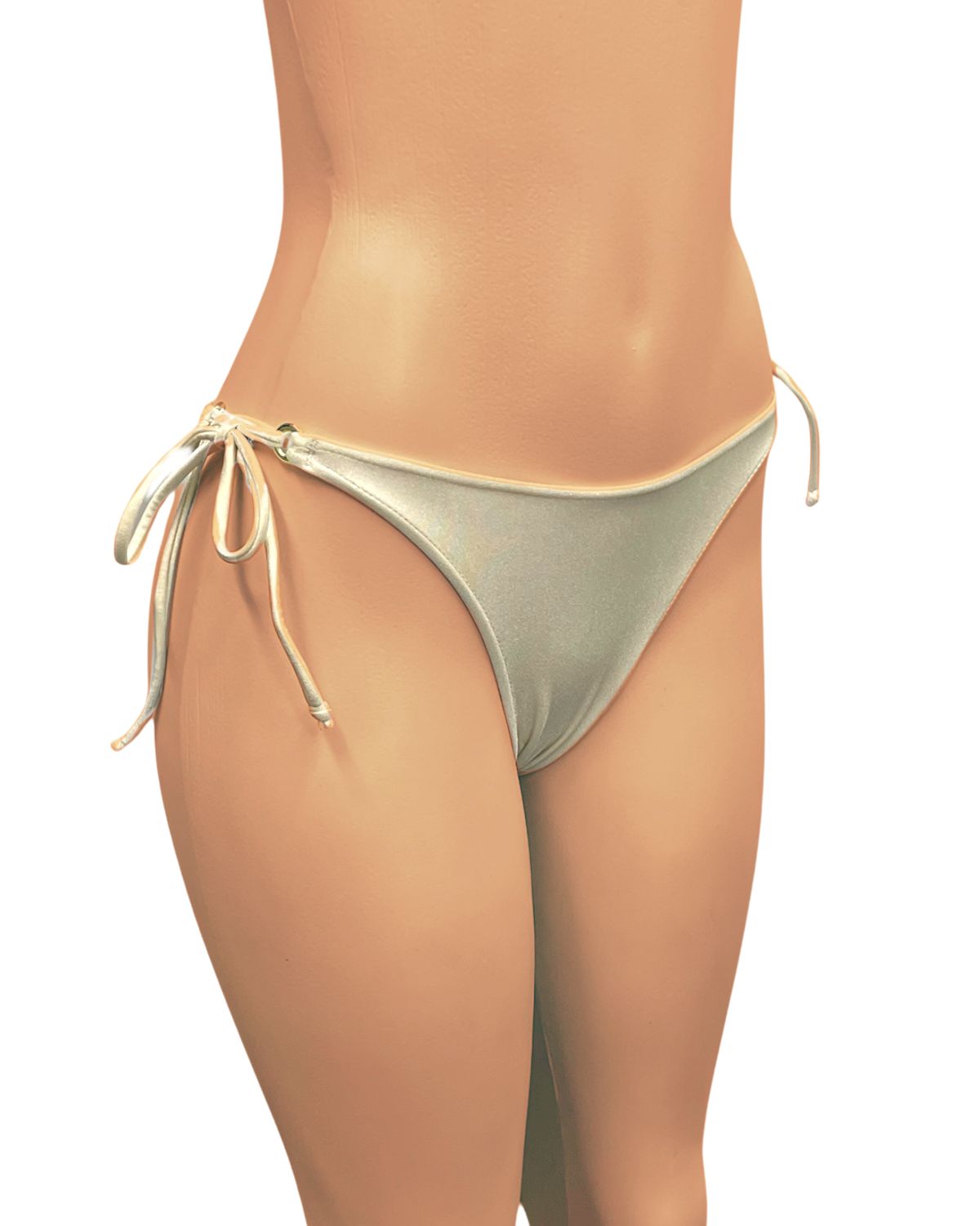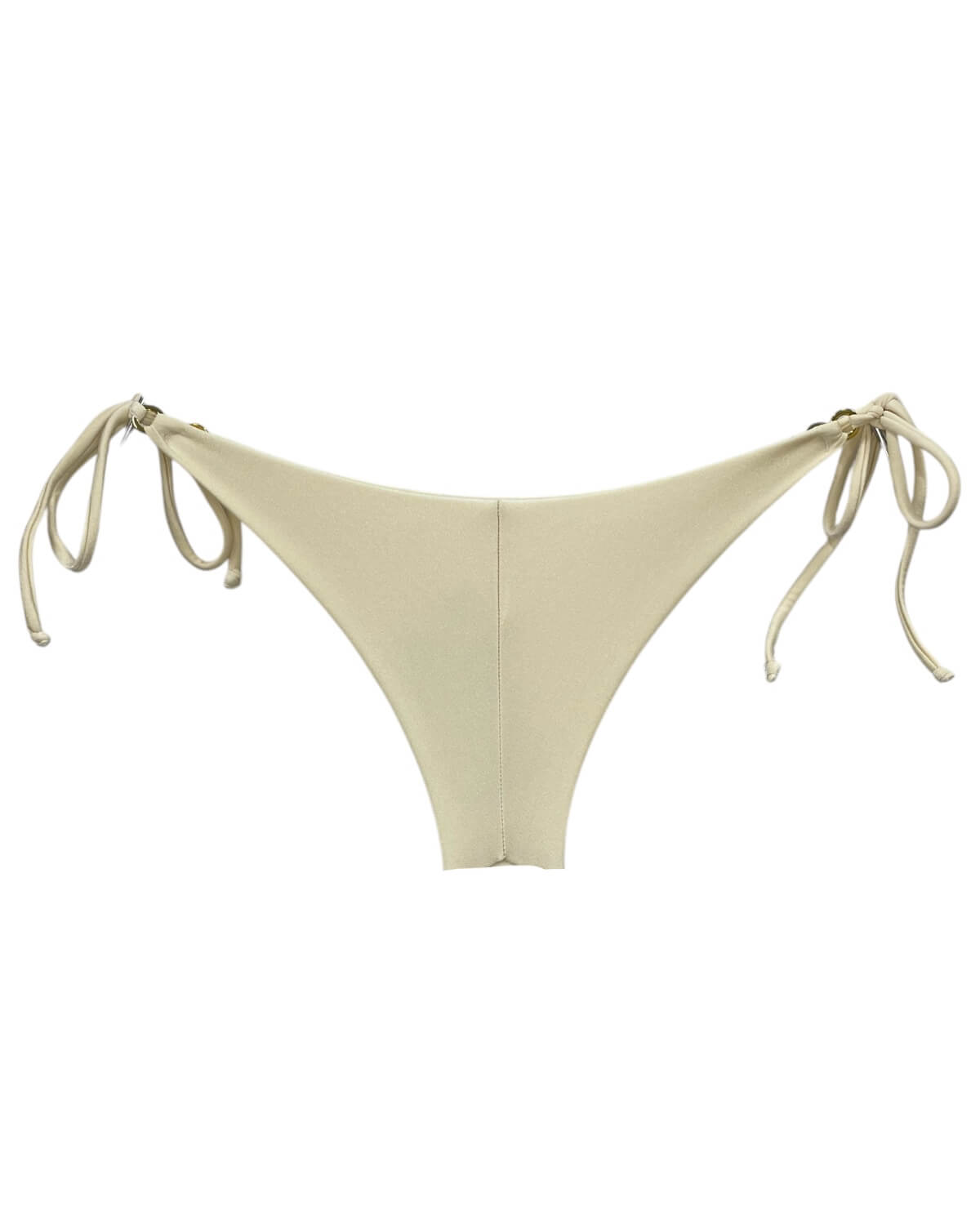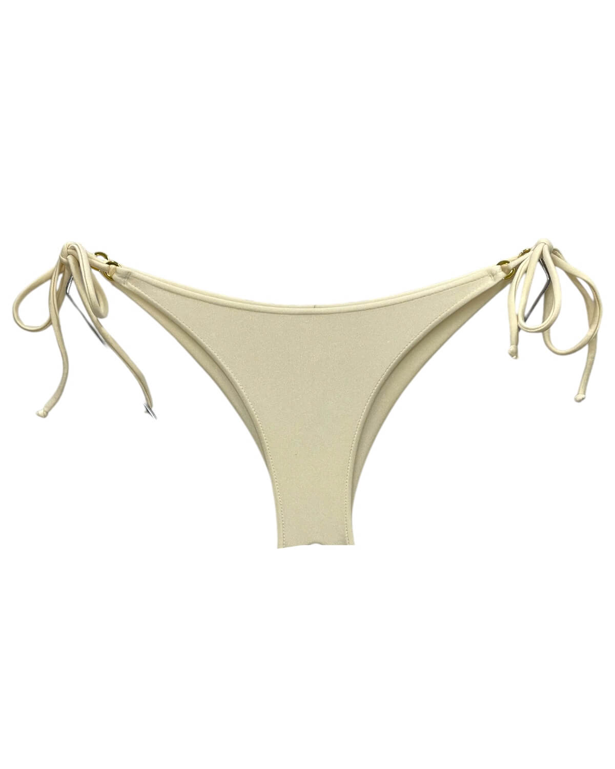 Tanga de biquíni sem costura na parte de traz, com amarração lateral e detalhe de argolinha dourada.