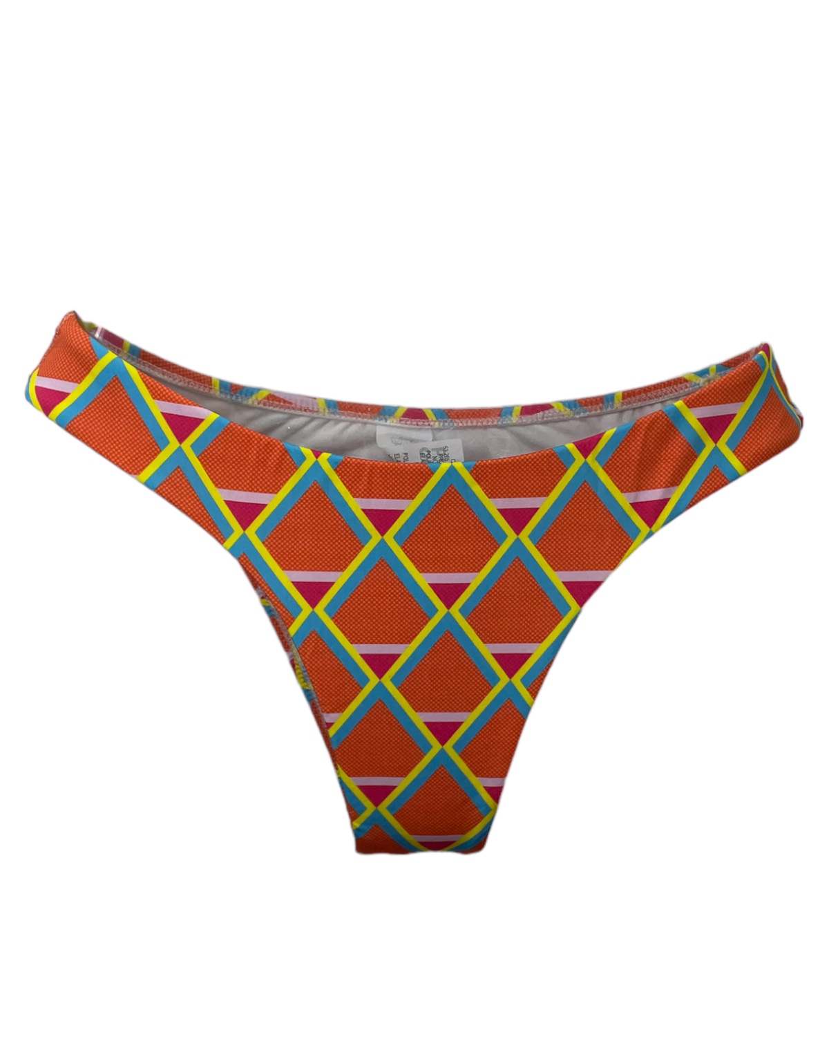 Tanga de biquíni básica estampa Power Laranja com frente sem costura aparente e costas com costura aparente.