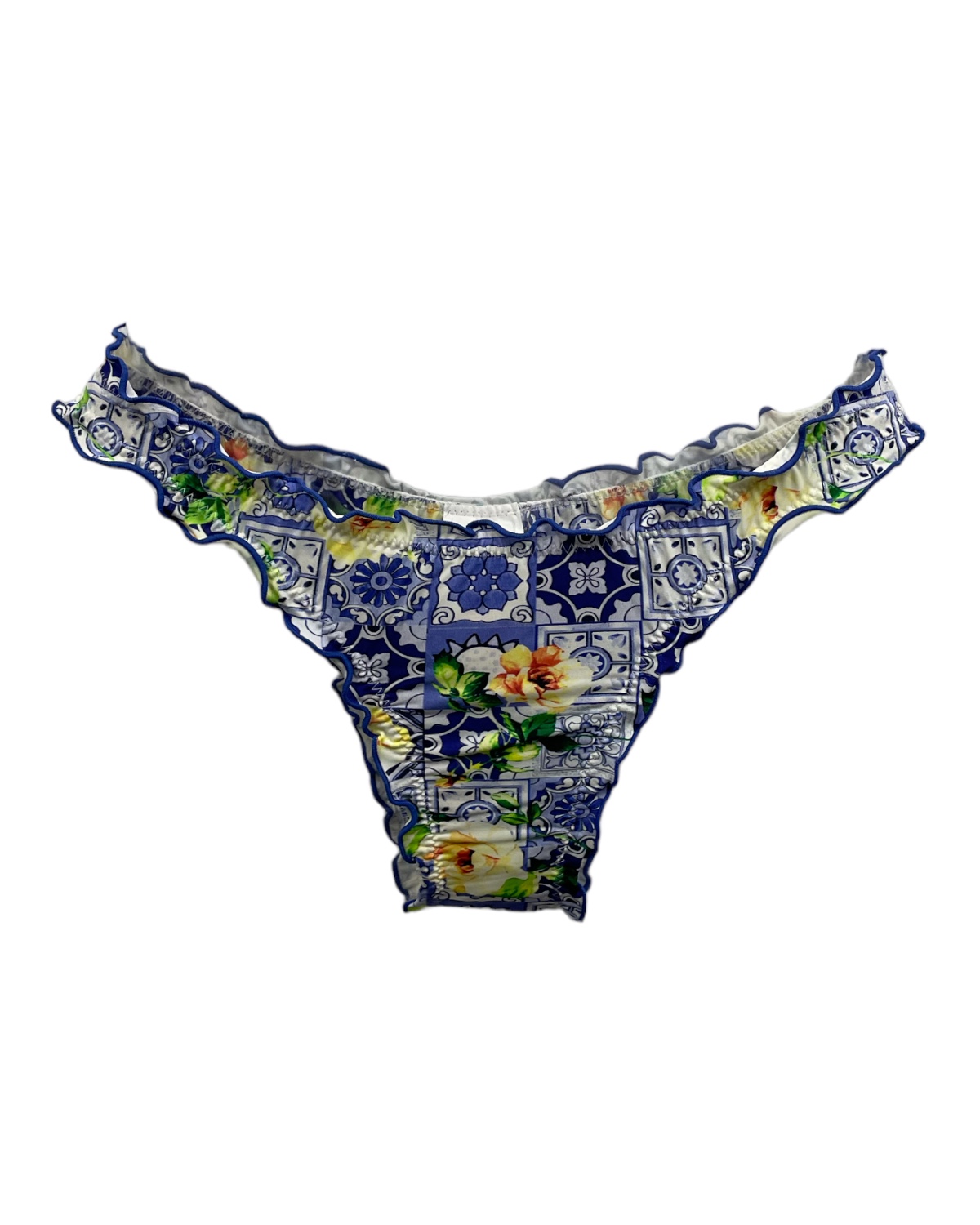 Tanga de biquíni com detalhe de babadinho contrastante. Modelagem pequena. Confeccionado com Tecido estampado.