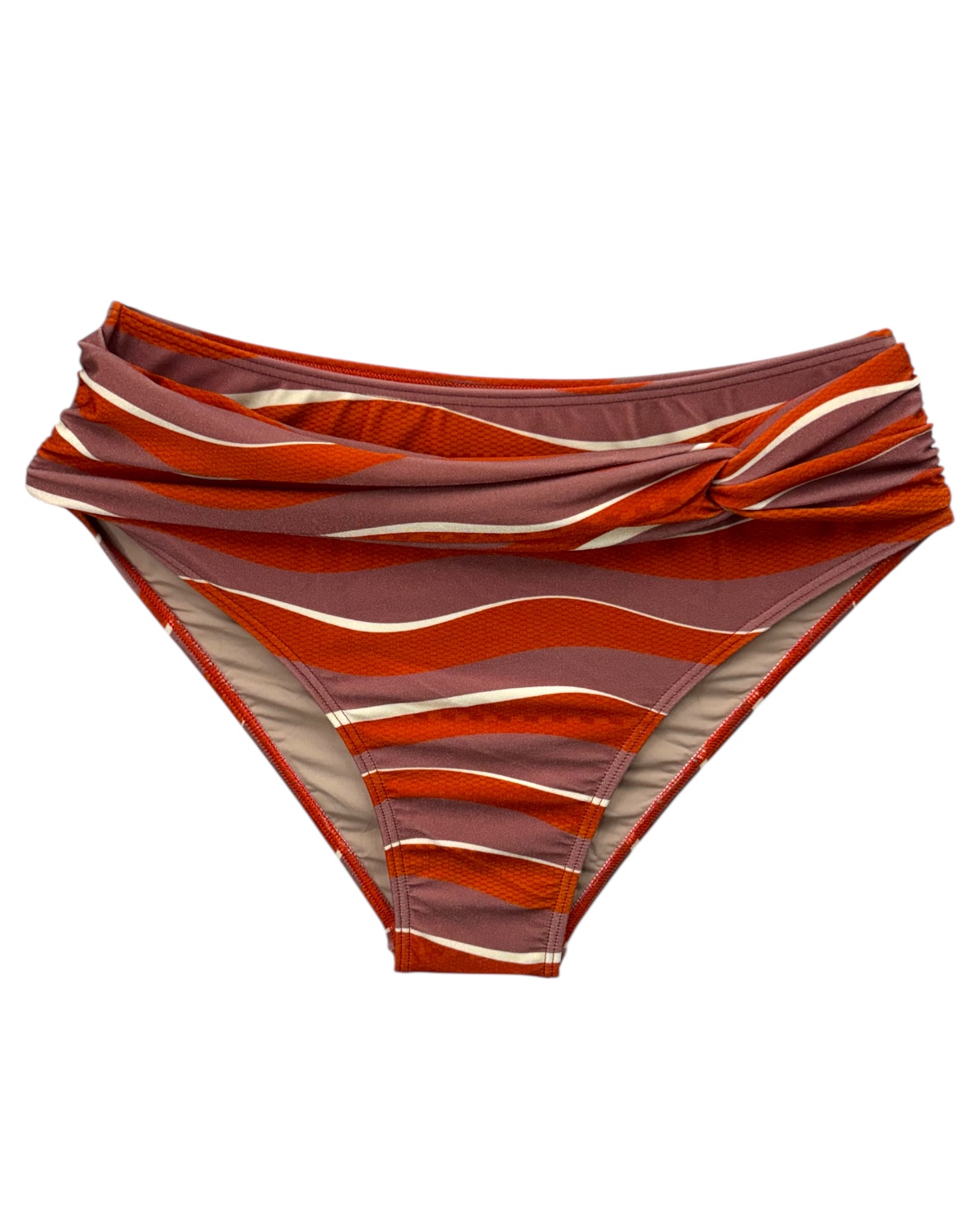 Tanga de biquíni modelo sunquíni, lateral larga e cós alto com detalhe somente na parte da frente de faixa entrelaçada formando um nó.