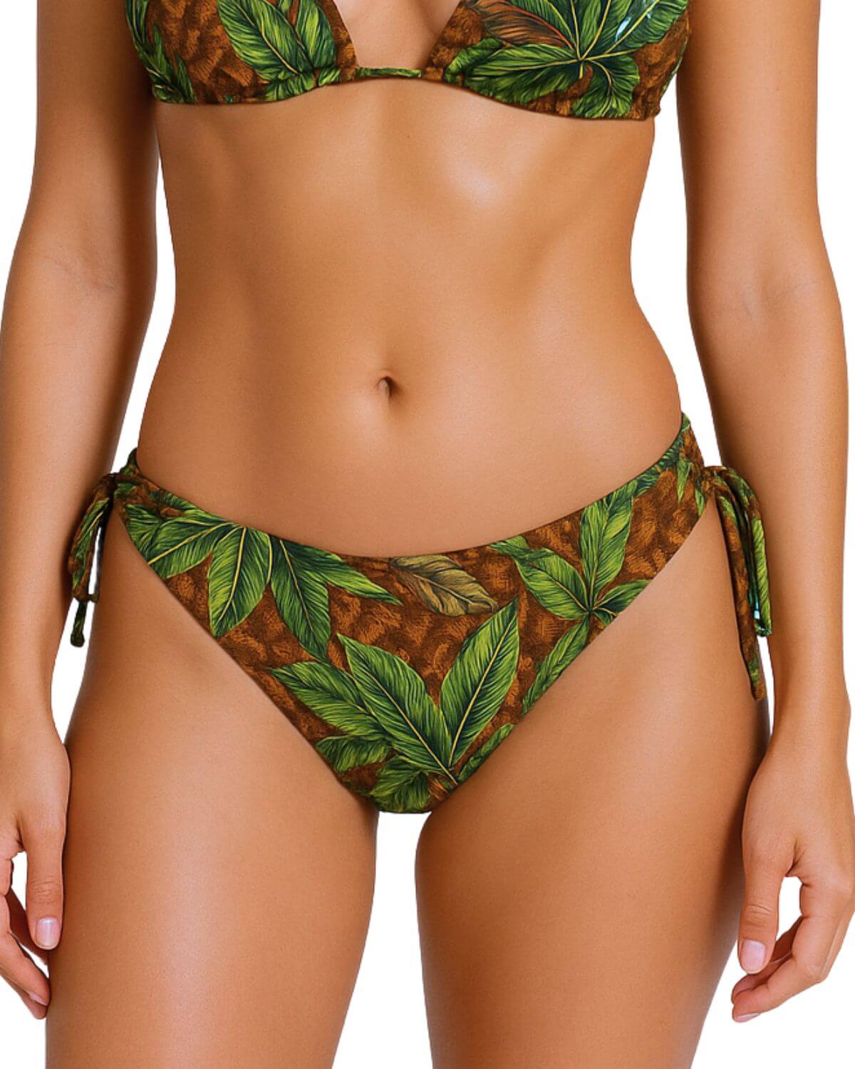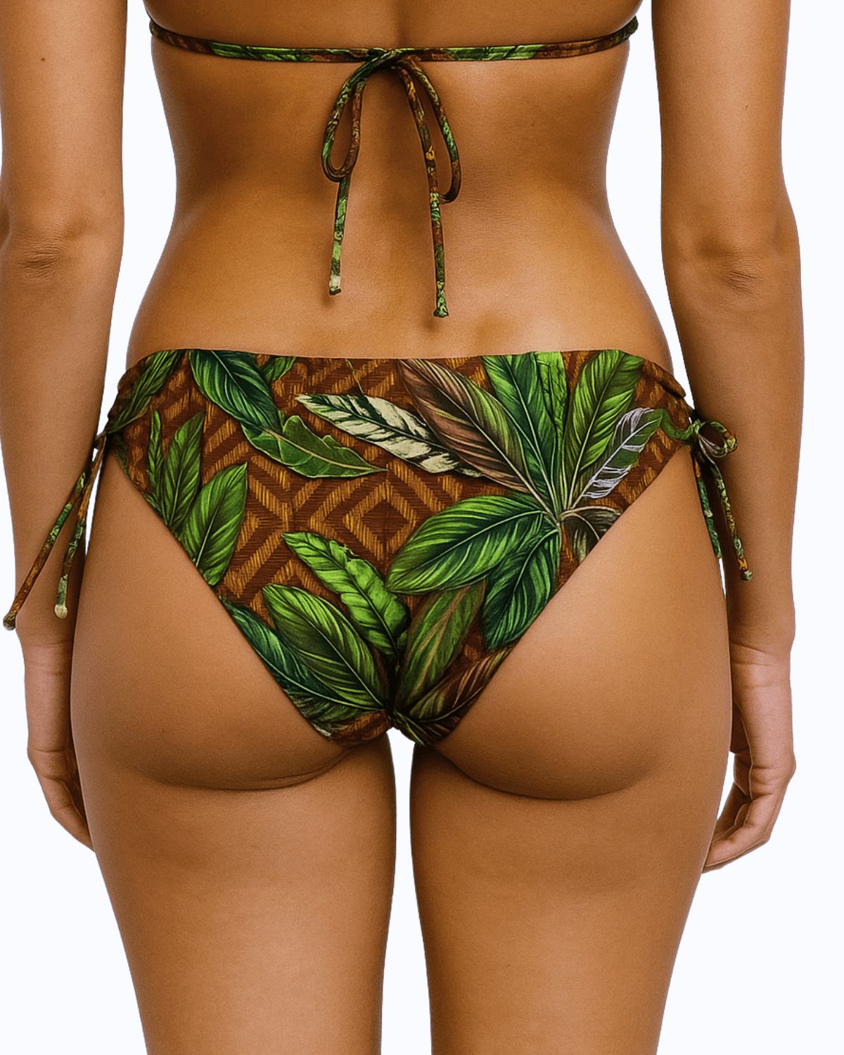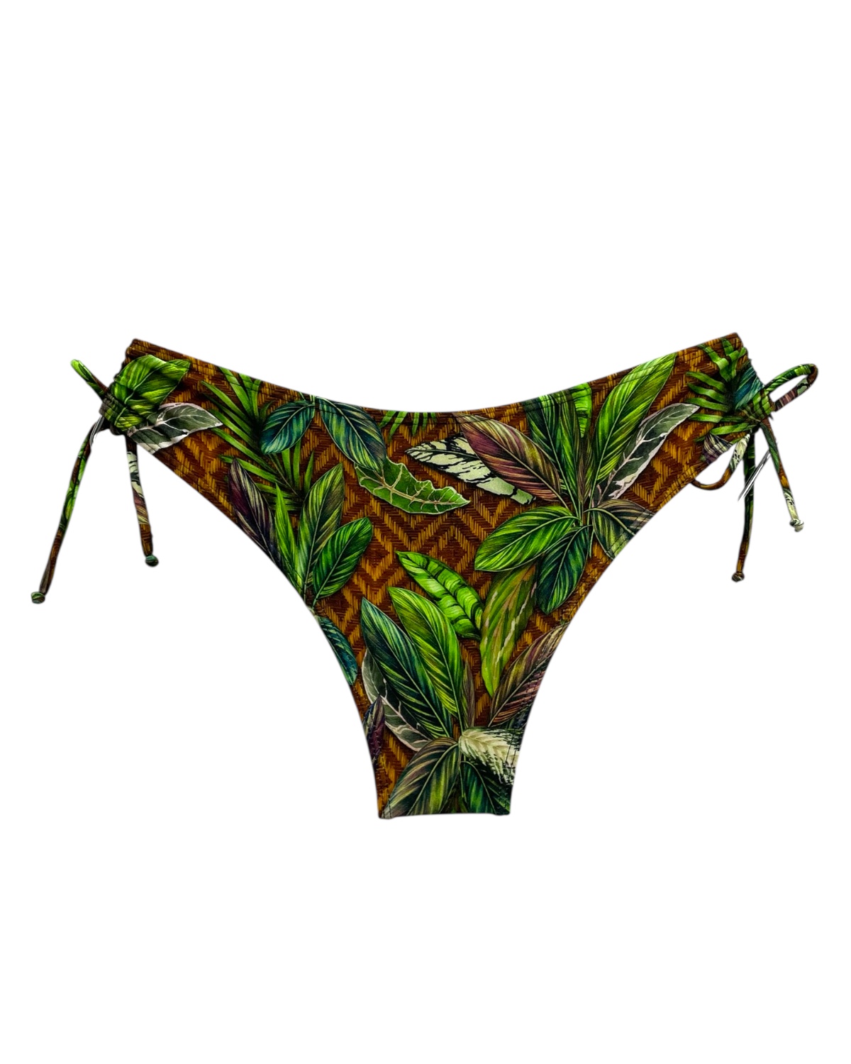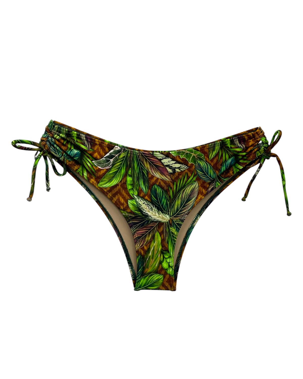 Tanga de biquíni lateral média com detalhe franzido e regulável.
