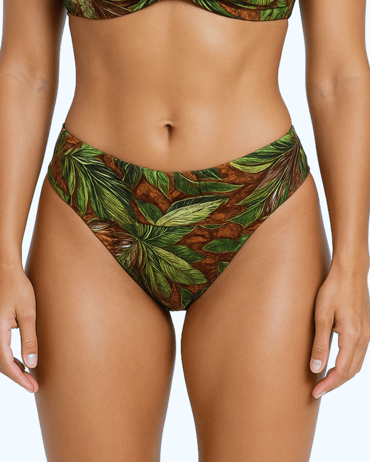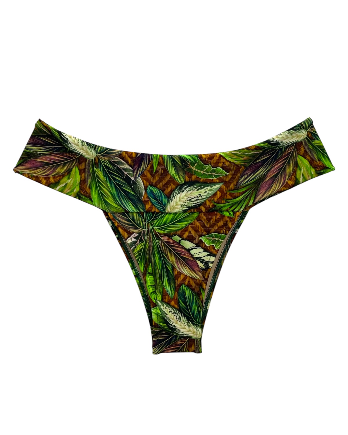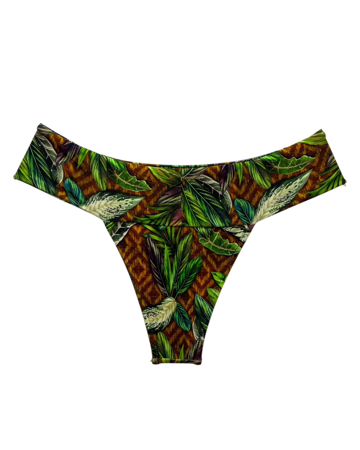 Tanga de biquíni estampada cós pala larga, modelagem média e levemente cavada no bumbum.