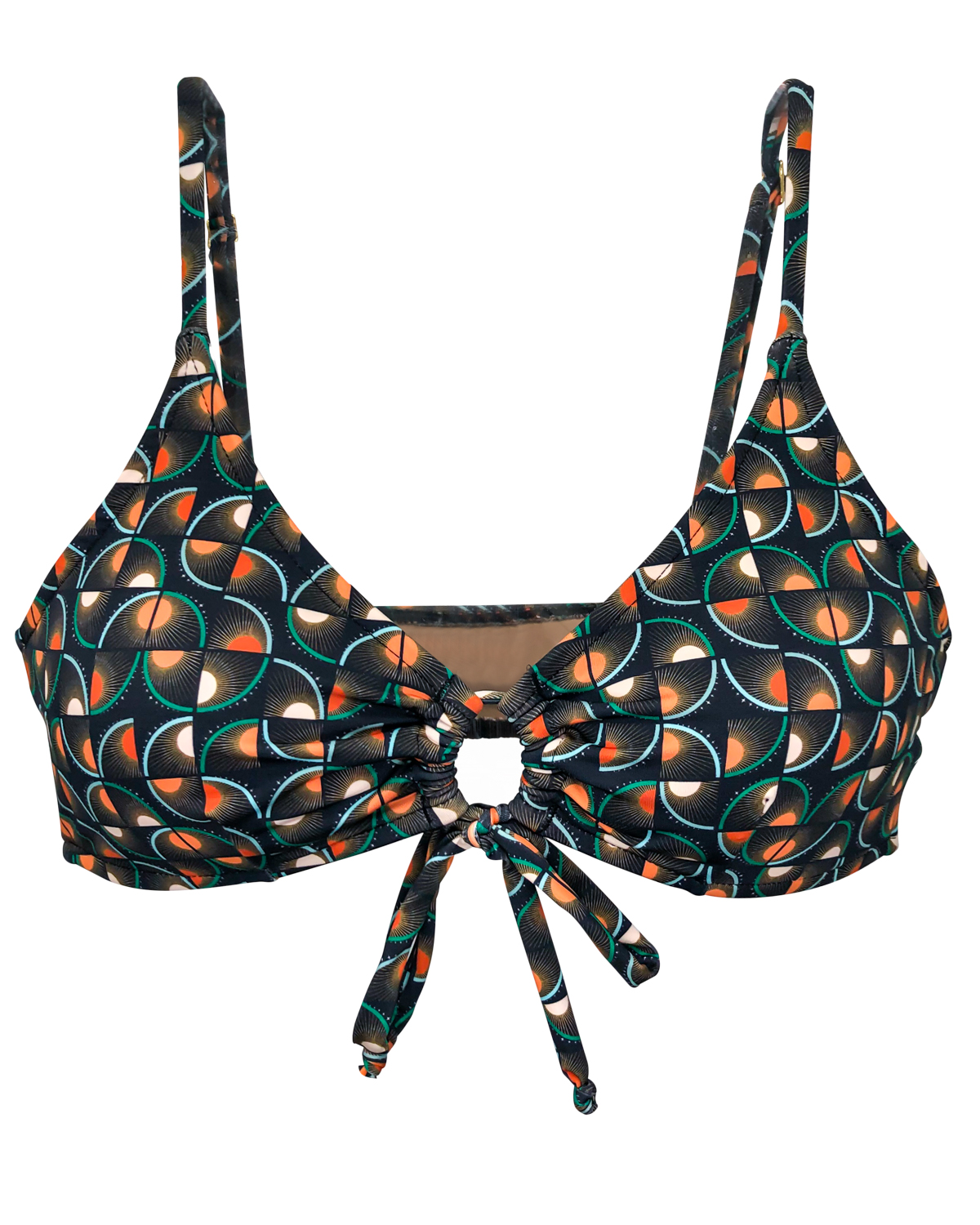 Top de biquíni estampado com amarração de laço frontal, alças reguláveis, costas reta e bojo removível. . Estampa solari