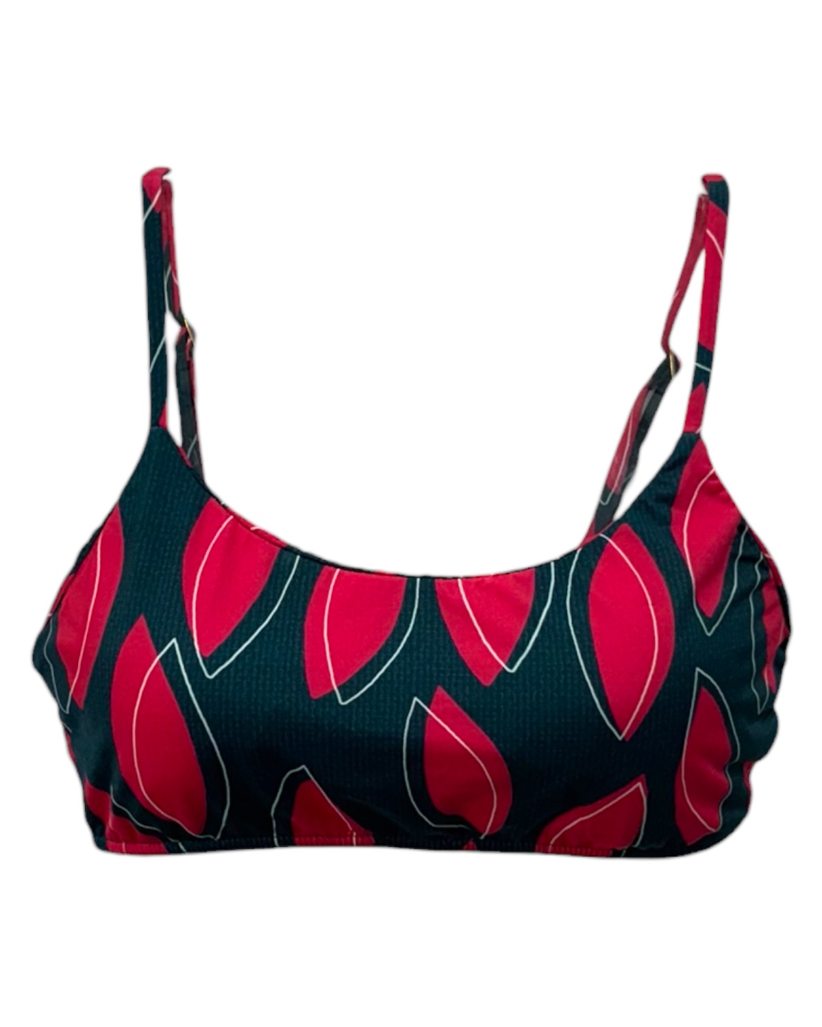 Top básico de biquíni estampado com decote redondo, costas reta, alças reguláveis e bojo removível.