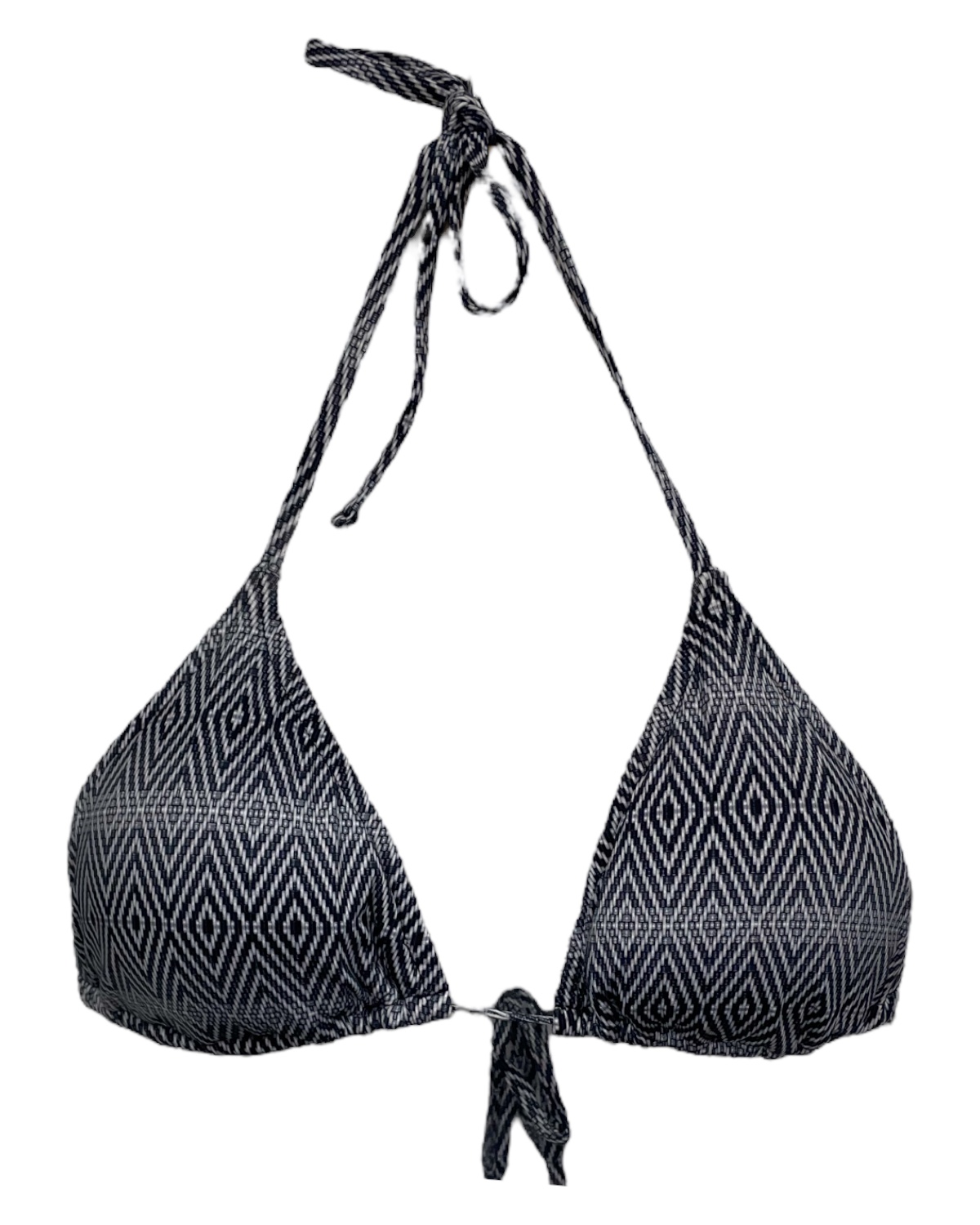 Top de biquíni modelo cortininha com bojo removível e amarração no pescoço e nas costas nas costas.