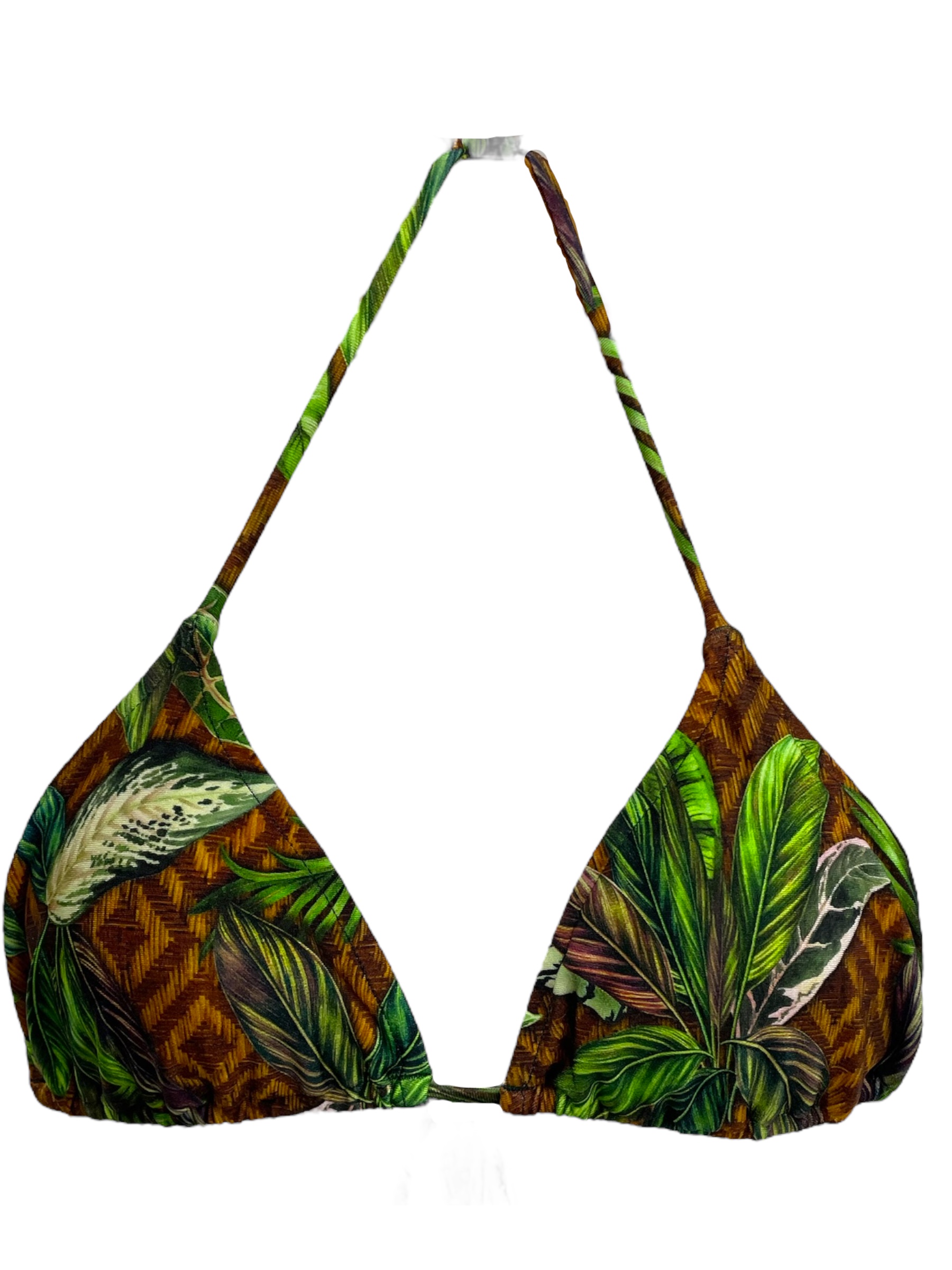 Top de biquíni modelo cortininha com bojo removível e amarração no pescoço e nas costas. Estampa: Ilha Bela