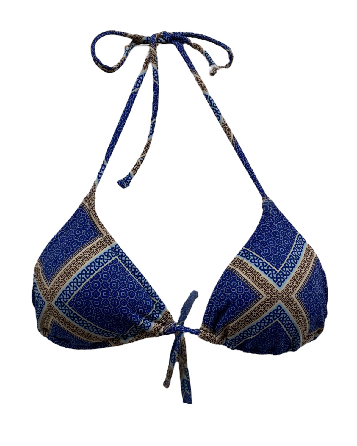 Top de biquíni modelo cortininha com bojo removível e amarração no pescoço e nas costas .