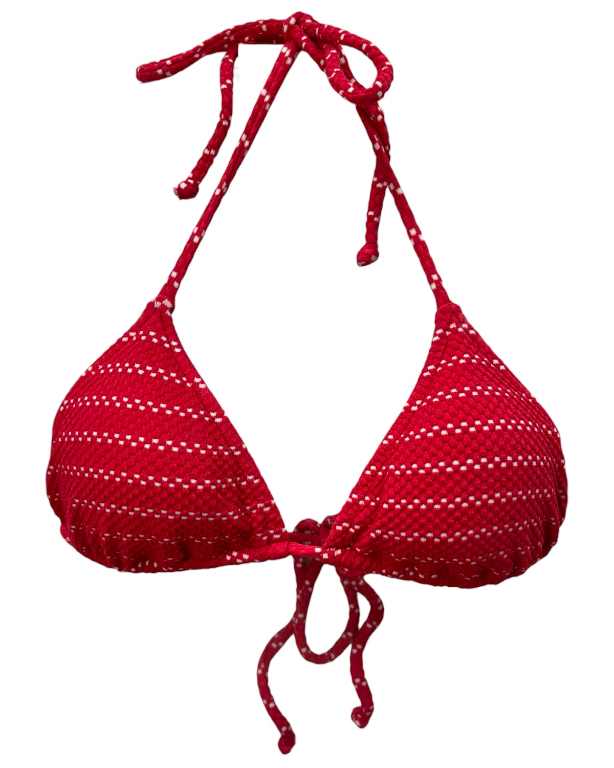 Top de biquíni modelo cortininha com bojo removível e amarração no pescoço e nas costas. Confeccionado em tecido com textura. Sua superfície apresenta leve relevo formando desenho em listras brancas. É um tecido confortável, sedoso e com elasticidade.