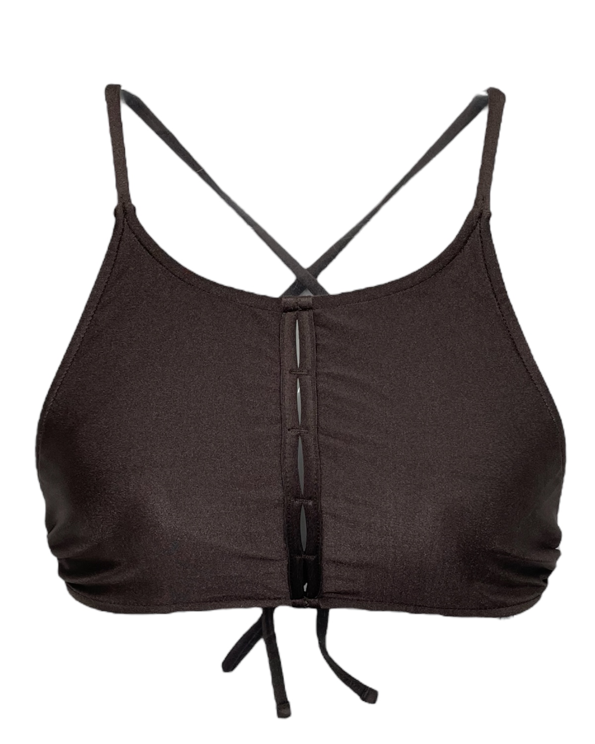 Top de biquíni modelo cropped com detalhe de costuras frontal sem bojo com decote abaixo do pescoço e cruzado nas costas.