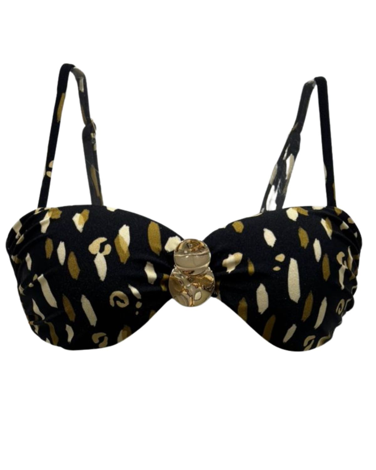 Top de biquíni estampado modelo tomara que caia com fivela em formato circular dourado , bojo interno fixo e amarração nas costas. Possui alças removíveis e ajustáveis. Modelo com boa sustentação pois possui liberdade de ajustes ao corpo.