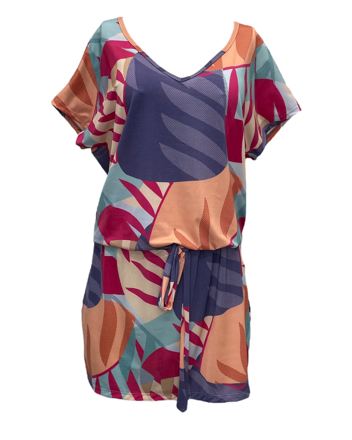 Vestido curto com amarração na cintura e decote V. Modelo confortável e ajustável ao corpo.