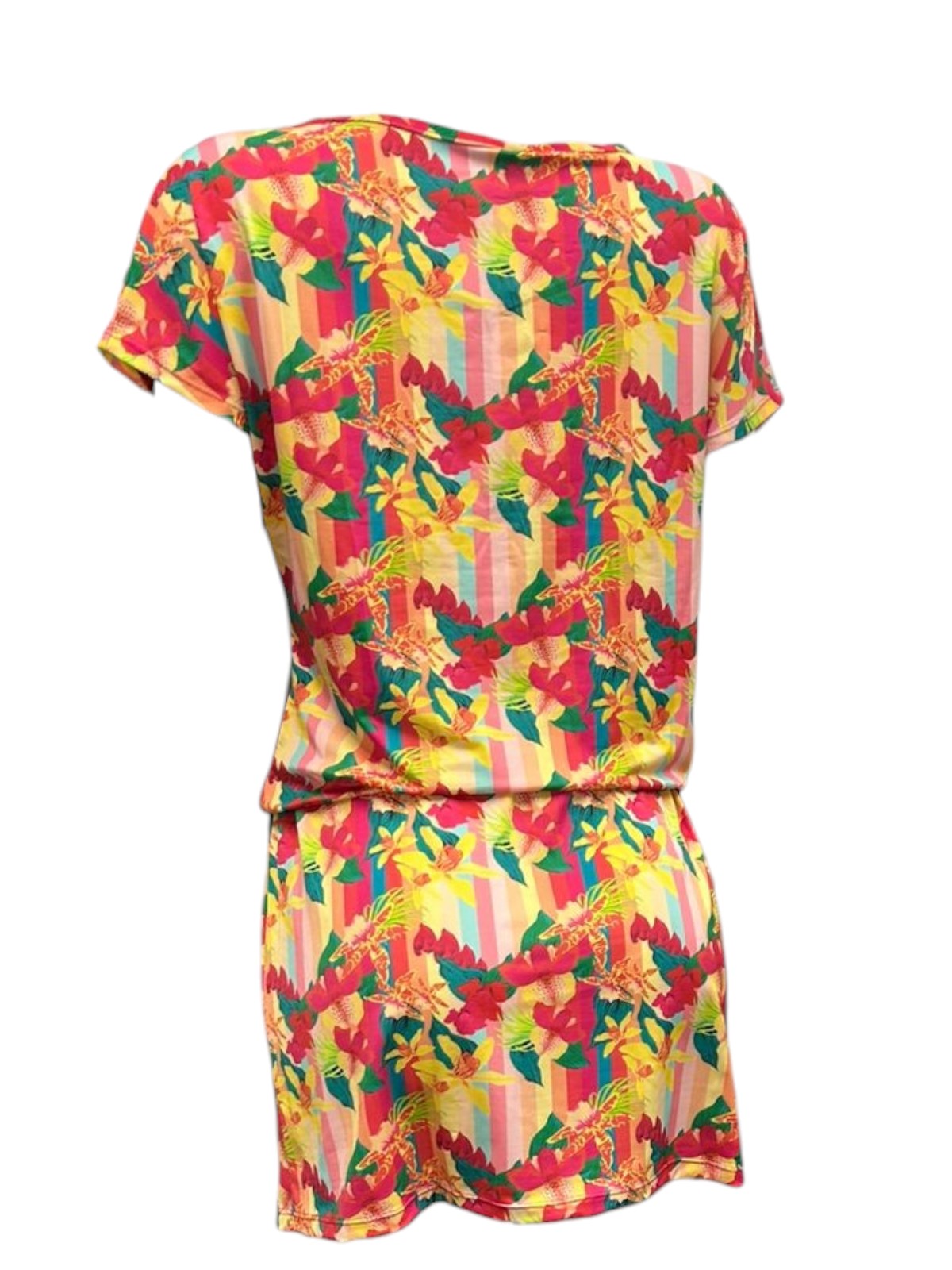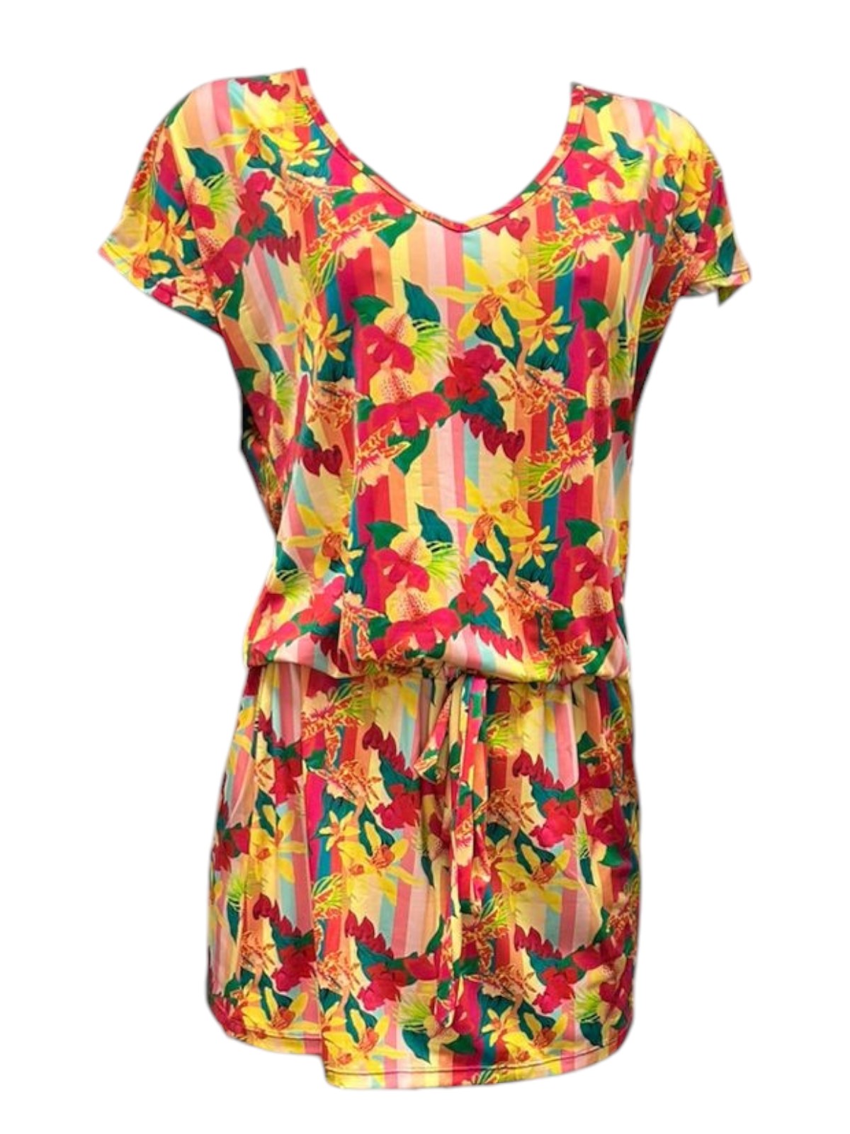 Vestido curto com amarração na cintura e decote V. Modelo confortável e ajustável ao corpo.