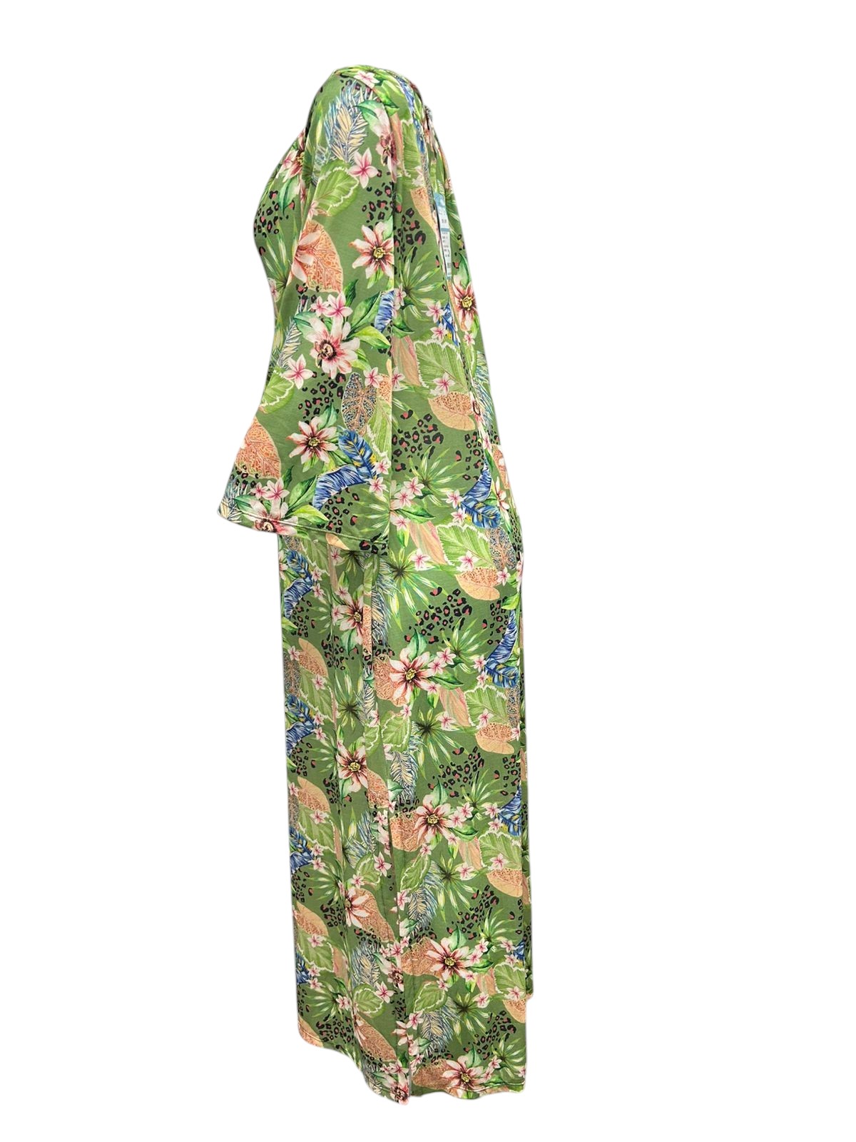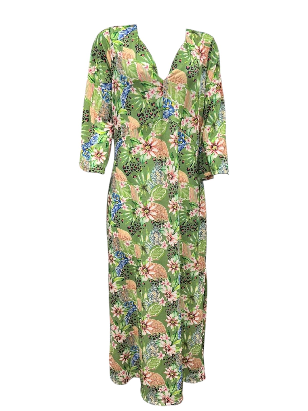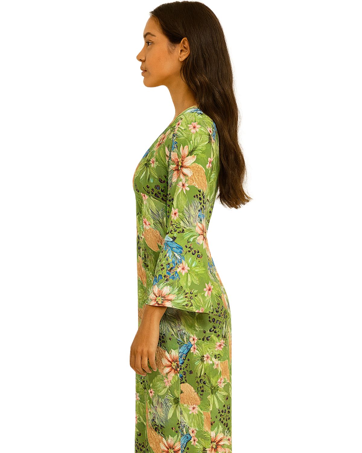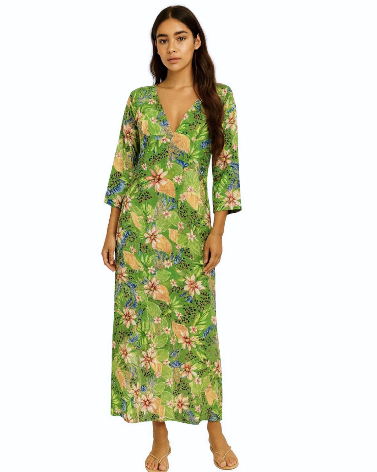Vestido longo manga 3/4 com fendas laterais, decote V frontal e recortes abaixo do busto. Possui modelagem solta. Confeccionada com tecido fluido com toque macio levemente transparente de secagem rápida. Peça ideal para ser usada também no casual.